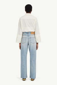 Embodying MM6's spirit of reinterpretation and nonconformity, these high-waisted denim 5-pocket trousers draw inspiration from music and street culture. While hinting at symbolic disorder, they feature a practical zip and button closure, belt loops, and a flattering straight-leg design. The back draws attention with the Maison's iconic white stitch line and numeric signature jacron label. Product Details Item ID S62LB0180S30589981 Composition: 100% cotton Pocket lining: 65% polyester, 35% cotton Blue denim 5 pocket trousers Light wash High waist Zip and button closure Belt loops Straight leg White stitch line and MM6 numeric signature jacron label at the back Made in Italy