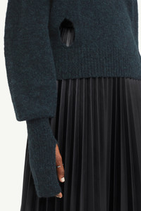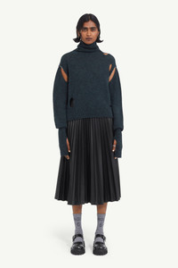 Jumper made of light hairy yarn. The distressed appearance and arm slits create a hybrid creation, a unique MM6 aesthetic. Visible stitching and thumb holes complete the design. The discreet yet distinct signature, a horizontal line of white stitches, is found on the back. Gauge 7. Product Details Item ID S52HA0274S18289962 Composition: 55% alpaca, 34% polyamide, 11% cotton Roll-neck jumper with torn details Gauge 7 Exposed threads Double fit sleeves Ribbed trims Elbow patches White stitch line at the back