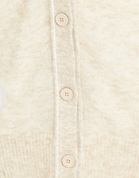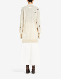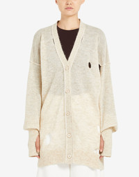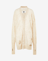 Hairy knit cardigan with large holes for a deliberately distressed look and cut-outs for the thumbs. The V-neck and dropped shoulders feature textured stitching to outline the silhouette. MM6’s discreet yet distinct signature, a horizontal line of white stitches, is found on the back of the garment. Gauge 7. Item details 62% Alpaca, 38% Polyamide Knitted Mélange Lightweight knit V-neck Long sleeves Button closing