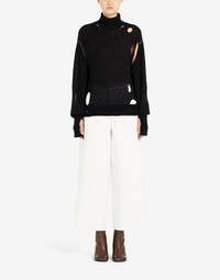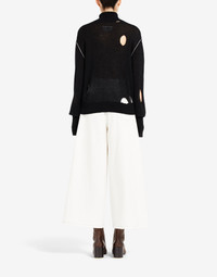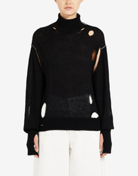 Hairy knit high-neck sweater with large holes for a deliberately distressed look and cut-outs for the thumbs. The shoulder seams feature contrast stitching. MM6’s discreet yet distinct signature, a horizontal line of white stitches, is found on the back of the garment. Gauge 7. Item details 62% Alpaca, 38% Polyamide Knitted Lightweight knit Turtleneck Long sleeves