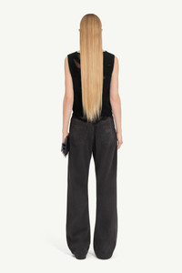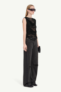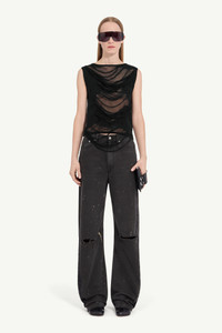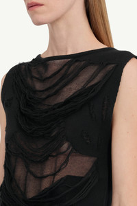 A high-neck top that disrupts convention with slashed and distressed details, revealing glimpses of contrasting textures beneath. At once revealing and enigmatic, it plays with layers to create new wearing possibilities, while the white stitch line at the back gives a quiet acknowledgement of the Maison's nonconformist signature. Product Details Item ID S62NC0169M13121900 Primary Fabric: 97% Cotton 3% Polyamide-Nylon Gauge 14 Cotton top Boat neck Sleeveless Slashed details White stitch line at the back