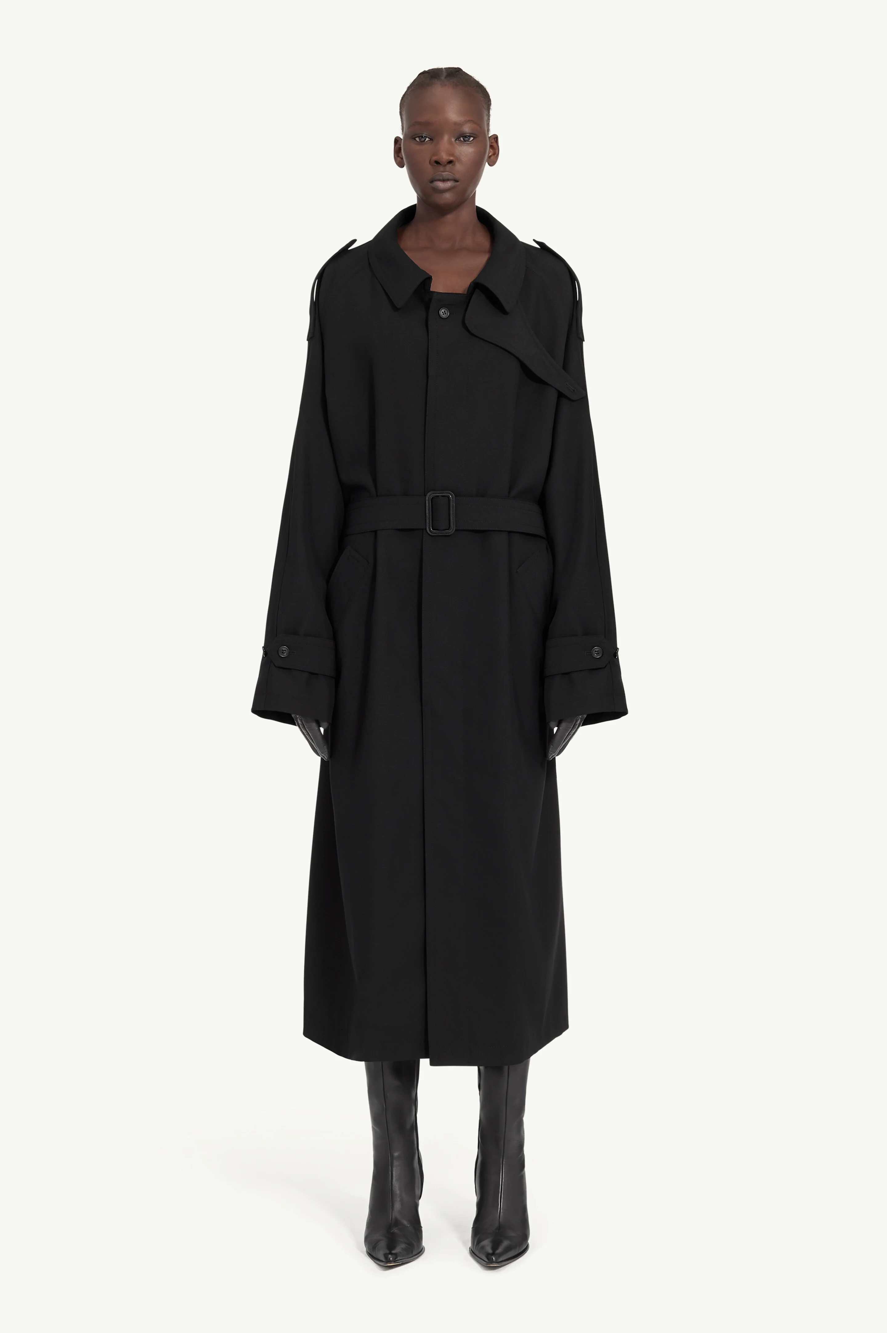 A refined take on the trench coat, reworked in pure wool for a structured drape. The classic storm flap and epaulettes are softened by dropped shoulders and a belted waist, creating a fluid yet composed silhouette. Finished with MM6’s discreet signature: the white stitch line at the back. Product Details Item ID S62AA0097M35653900 Primary fabric: 100% Virgin Wool Long trench coat in wool Storm flap Dropped shoulders Buttoned epaulettes Self-fabric belt Buttoned cuffs White stitch line at the back Made in Italy Model is 179 cm tall and wears a size 42.
