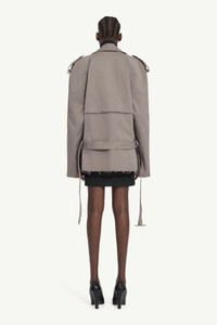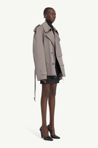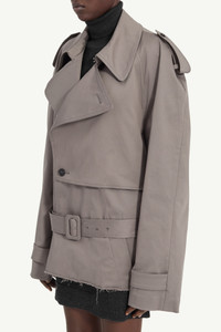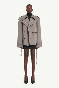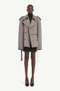 The Maison reduces the trench to its essentials, then twists the construction. Cropped and cut wide at the shoulders, it’s cinched with a layered belt and left raw at the hem. Epaulettes and oversized lapels heighten its utilitarian slant. Finished with the MM6 white stitch line at the back. Product Details Item ID S62AN0154S54452810 Primary fabric: 97% Cotton Secondary fabric: 3% Elastane Cropped trench coat with belt Wide notched lapels Shoulder epaulettes Dropped shoulders Raw-cut hem Side welt pockets White stitch line at the back Made in Italy Model is 179 cm tall and wears a size 42.