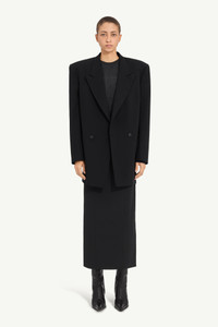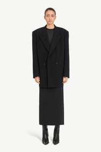 A sharply tailored blazer dress, cut to exaggerated proportions. Padded shoulders and an oversized silhouette recall 80s power dressing, while the short hemline and double-breasted front introduce contrast and subversion. At the back, the MM6 white stitch line asserts its signature. Product Details Item ID S62BN0117M35614900 Primary fabric: 67% Wool, 30% Cotton, 3% Elastane Oversized double-breasted blazer dress Notched lapels and padded shoulders Buttoned front and flap pockets Buttoned cuffs White stitch line at the back Made in Italy Model is 180 cm tall and wears a size 42.