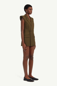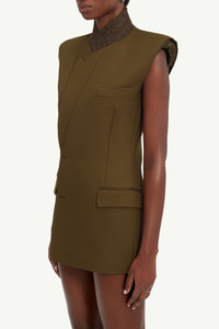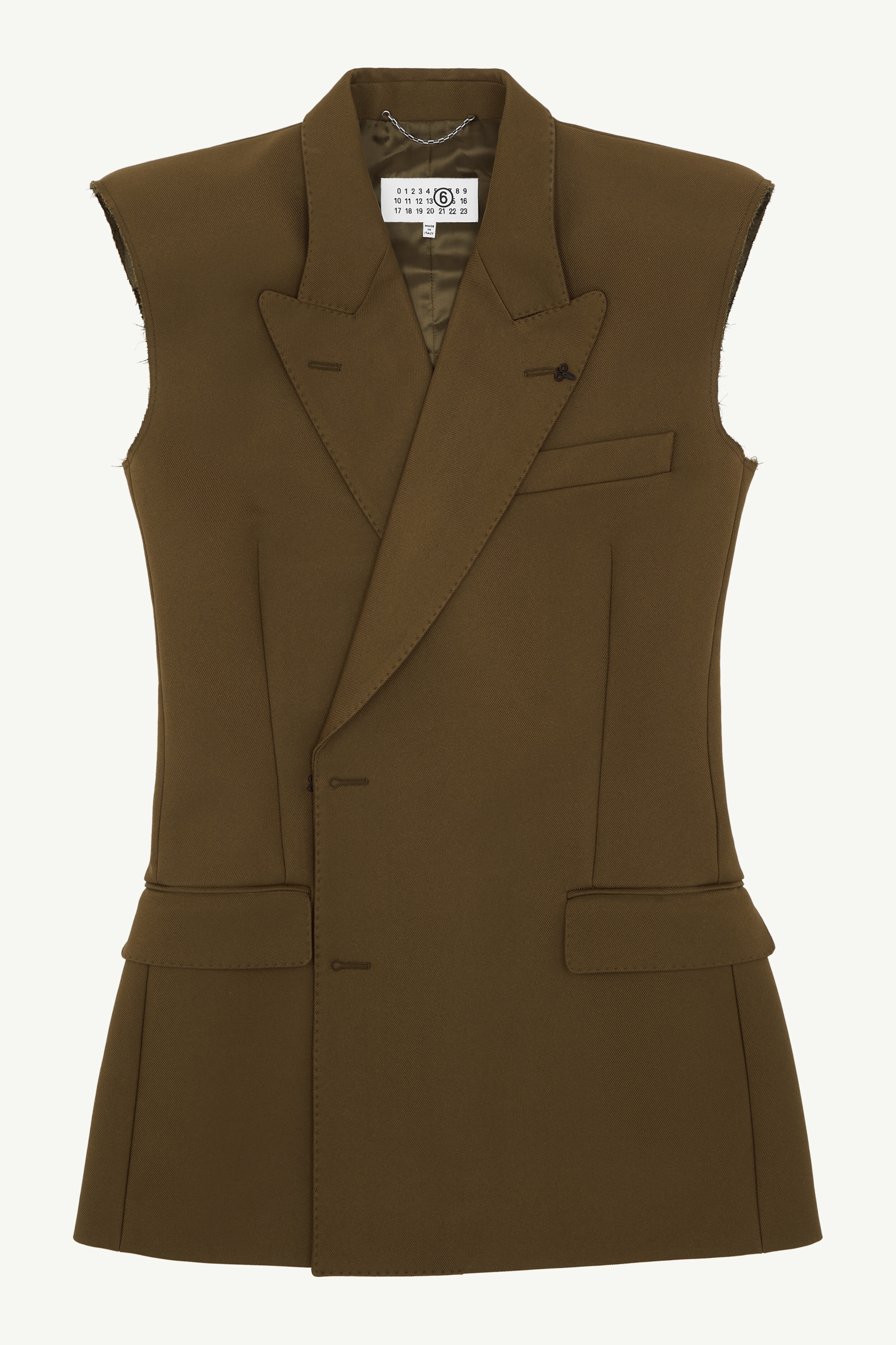 Fashioned with MM6's boundary-pushing design ethos, this twill gilet boasts a distinguished peak lapel and double-breasted button closure. It embraces unconventional details like raw-edge shoulders and functional welt and flap pockets, while a subtle white stitch line at the back highlights the Maison's signature. Product Details Item ID S62FB0067M35222159 Composition: 100% polyester Lining: 100% viscose-rayon Polyester twill gilet Peak lapel Double-breasted button closure Raw-edge shoulders Welt chest pocket Flap pockets White stitch line at the back Made in Italy