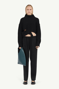 These wool trousers are fitted to a signature elongated frame and feature extended drawstring and side pockets. MM6’s discreet yet distinct signature, a horizontal line of white stitches, is also found on the back of the garment. Product Details Item ID S52KA0512M35153900 Primary fabric: 54% polyester, 44% virgin wool, 2% elastane Pocket lining: 100% cotton Tailoring wool trousers Regular waist Drawstring closure Straight leg Side pockets White stitch line at the back Made in Portugal Model is 5'8'' tall and wears a size 42.
