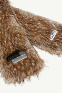 This faux fur scarf interrogates codes of comfort in exaggerated volume and a wild, tactile finish. The Maison’s twin labels – one reversed, both exposed – bring an unexpected tension to its plush surface. Product Details Item ID SH0TE0001M35464001F Primary Fabric: 80% Acrylic, 20% Polyester Voluminous faux fur scarf Integrated slit detail Dual artwork patch at the hem Made in Italy