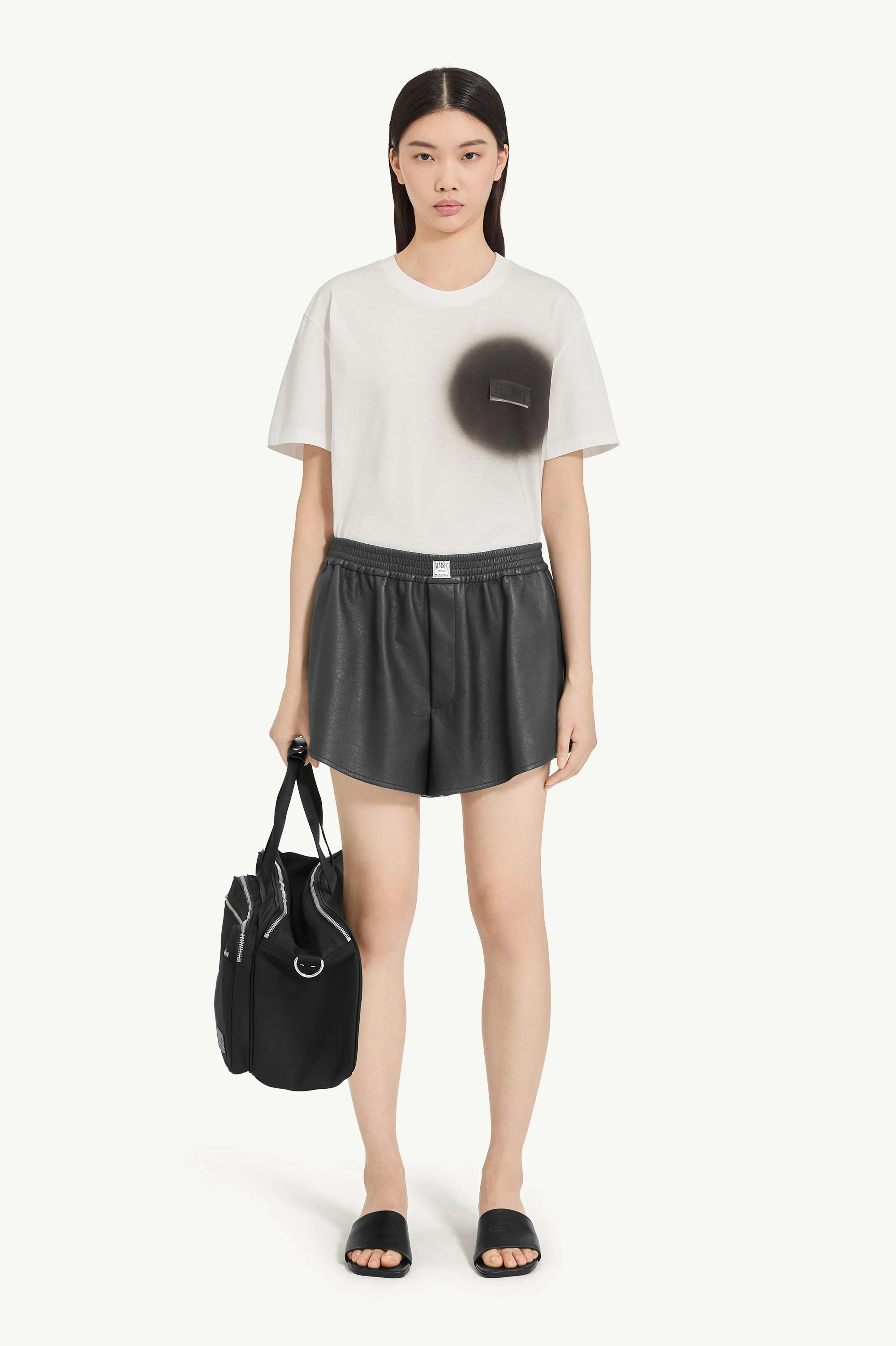 These faux leather shorts balance sportswear ease with a refined finish. An elasticated waistband, accented by the Margiela Six label, frames the clean, relaxed fit. At the back, the MM6 white stitch line asserts its signature. Product Details Item ID S52MU0134M35740900 Primary fabric: 100% polyester Coating: 100% polyurethane Pocket lining: 100% cotton Shorts, relaxed fit Elasticized waistband closure White stitch line at the back Made in Italy