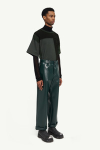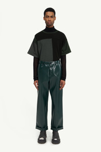 Straight-leg trousers in bonded faux leather with a turned-up cuff detail and belt loops. MM6’s discreet yet distinct signature, a horizontal line of white stitches, is found on the back of the garment. Product Details Item ID S62KB0119S60352650 Details Composition: Fabric: 100% Polyester - Coating: 100% Polyurethane - Pocket Lining: 100% Cotton