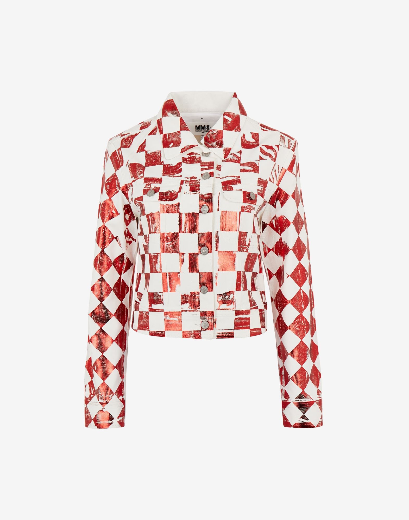 Fitted denim jacket in chess mylar print, inspired by the Surrealist movement. Brings the pattern to life by creating a sheen on the fabric. An all-over 6 print lining and transparent Margiela 6 logo on the back adorn the design while a front button closure and pockets complete it. Item details 100% Cotton Denim Brand logo Classic Neckline Checked Long sleeves Buttoned cuffs Dual chest pockets Coated effect Button closing