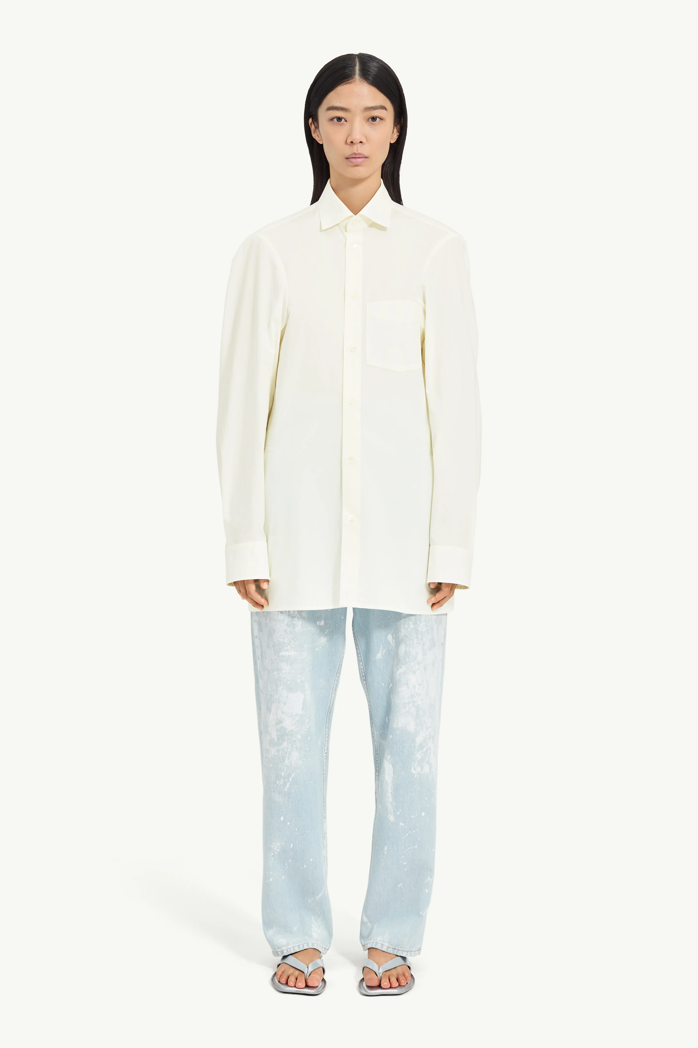 A classic shirt reconfigured through flattening. The sleeves move forward, altering the balance of the silhouette and reducing the sense of depth. The result is a sharper, more graphic outline that reframes everyday shirting through construction. At the back, the MM6 white stitch line marks its signature. Product Details Item ID S62DT0053M35256101 Primary fabric: 100% cotton Cotton poplin Long sleeves Shirt collar Front button closure White stitch line at the back Made in Italy