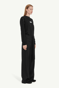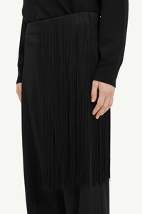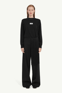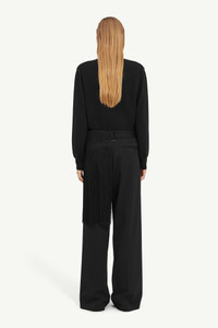 These wool suit trousers redefine classic tailoring with a regular waist and wide leg silhouette. Central pleats and tonal fringes introduce an unexpected twist to the sleek design, coupling formal sophistication with a hint of rebellion. Side pockets add practicality, while the discreet white stitch line at the back highlights the brand's signature. Product Details Item ID S52KA0522S47848900 Primary fabric: 54% polyester, 44% virgin wool, 2% elastane-spandex Pocket lining: 100% viscose-rayon Application: 100% acetate Tailoring wool suit trousers Regular waist Wide leg Tonal fringes Central pleats Side pockets White stitch line at the back Made in Italy