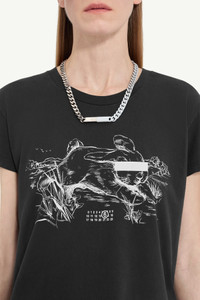 A white rabbit print and the text "Suis le lapin blanc" transform this T-shirt into a cryptic invitation to explore the unexpected. The slashed hem introduces versatility and movement, reflecting MM6’s deconstructive ethos and playful reinterpretation of wardrobe staples. Product Details Item ID S62GD0199M20108899 Primary Fabric: 100% Cotton Heavy cotton jersey T-shirt Crewneck Short sleeves Front rabbit print Raw-edge hem White stitch line at the back Slim fit Cropped Made in Italy