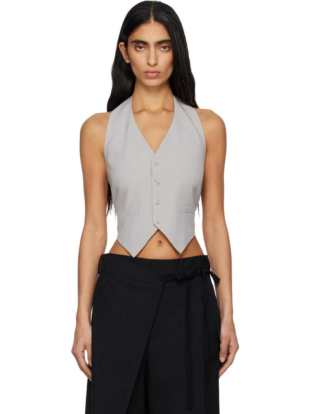 Virgin wool-blend canvas vest. · V-neck · Button closure · Mock welt pockets at waist · White stitching at fixed halter strap · Self-tie fastening at back · Satin twill lining Supplier color: Pale Grey Body: 55% polyester, 45% virgin wool. Lining: 100% viscose. Made in Italy 261188F068001