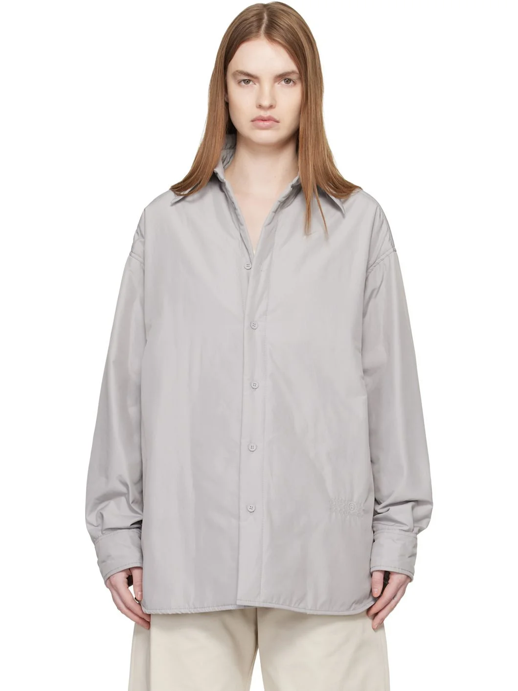 Padded taffeta jacket. · Spread collar · Button closure · Logo embroidered at front · Shirttail hem · Dropped shoulders · Pleat at barrel cuffs · White stitching at back yoke · Welt pocket at interior · Full taffeta lining Supplier color: Stone grey Body: 100% polyester. Fill: 100% polyester. Lining: 100% viscose. Pocket lining: 100% viscose. Made in Italy 261188F109019