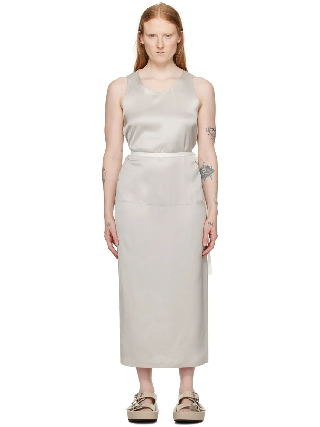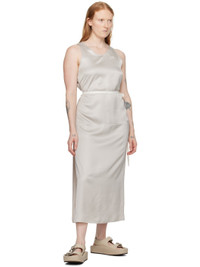 Viscose satin dress. · Paneled construction · Crewneck · Pinched seam at front · Vent at hem · Integrated self-tie grosgrain belt at side seams · White stitching at back collar Supplier color: Greige