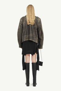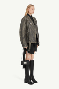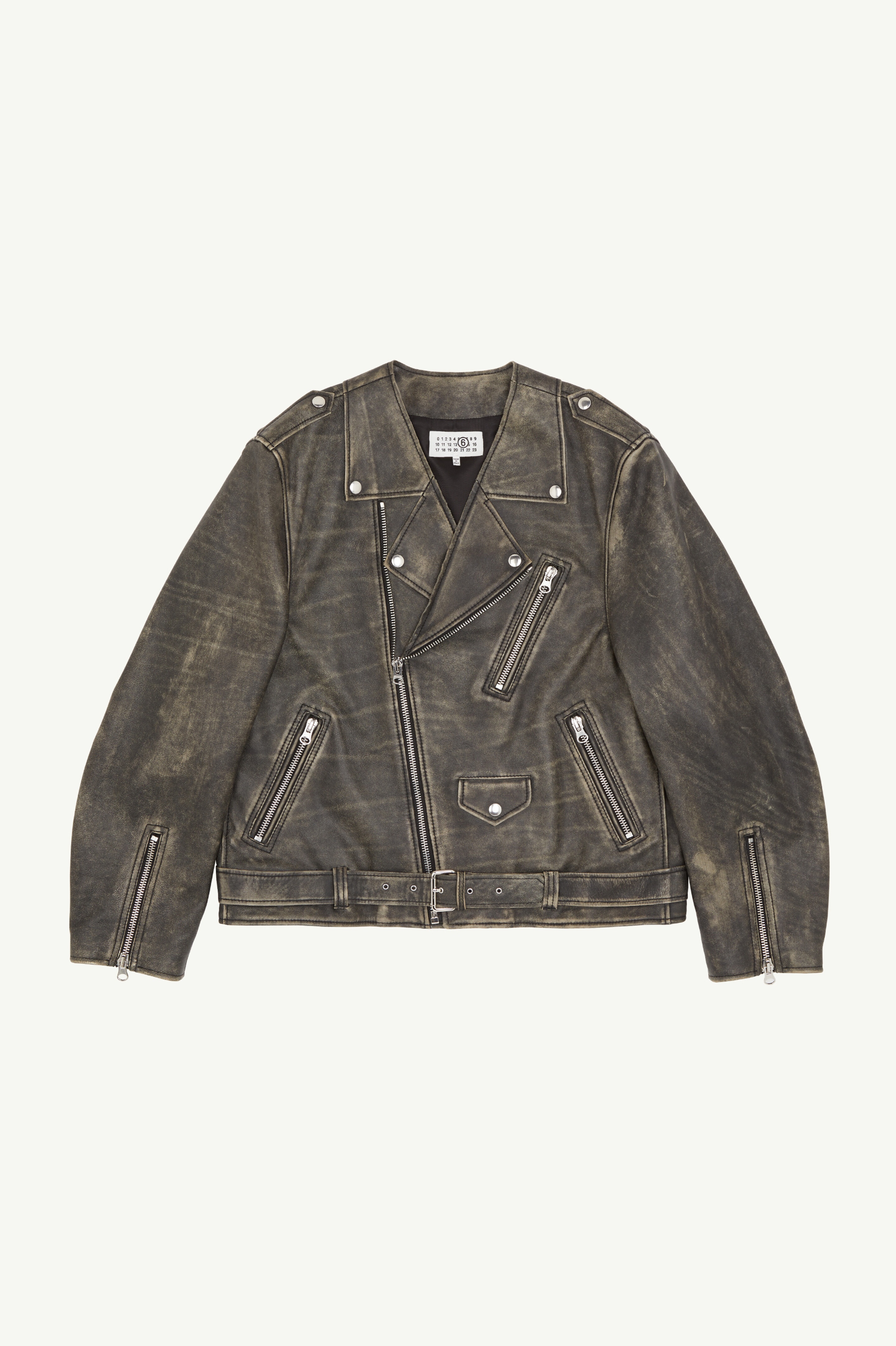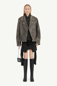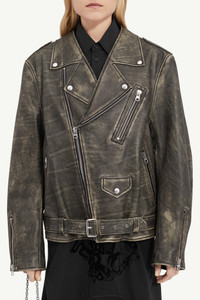 Biker jacket shaped to a boxy, oversized fit from lightly distressed leather. The style also features wide notched lapels and a belt, as well as buttoned flap pockets. MM6’s discreet yet distinct signature, a horizontal line of white stitches, is also found on the back of the garment. Product Details Item ID S52AM0305M07001143 Primary fabric: 100% calf leather Lining: 100% viscose-rayon Pocket lining: 100% cotton Heavy leather biker jacket Wide notched lapel Zip closure Zipped pockets Buttoned flap pocket Zipped cuffs Belted waist White stitch line at the back Made in Italy Model is 5'8'' tall and wears a size 42.