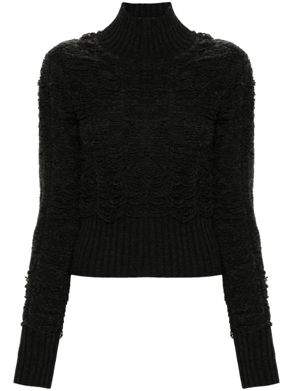 high-neck distressed jumper Highlights - Anthracite grey - Virgin wool blend - Distressed effect - Ribbed trim - High neck - Long sleeves - Straight hem Imported Composition Acrylic 50%, Virgin Wool 50% SIZE & FIT Model measurements Height 5 ft 11 in(1.8 m) Bust/Chest 32.67 in(83 cm) Hips 36.22 in(92 cm) Waist 25.19 in(64 cm) FittingInformation Designed for a slim fit that sits just away from the body offering a close yet comfortable fit Made with a midweight knit, this piece offers some stretch This piece fits true to size – take your usual size