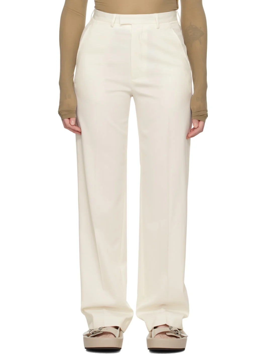 Plain-woven stretch polyester- and virgin wool-blend trousers. · Belt loops · Three-pocket styling · Zip-fly · Creases at front and back legs · Darts and white stitching at back waist · Partial viscose satin lining Supplier color: Off white