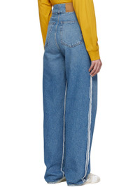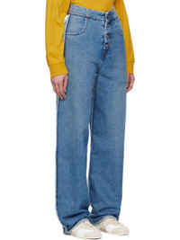 Non-stretch denim jeans. · Fading and raw edges throughout · Four-pocket styling · Exposed button fly · Jacron logo patch at back waistband · White stitching at back waist · Contrast stitching in tan Supplier color: Medium blue 100% cotton. Made in Italy 252188F069009