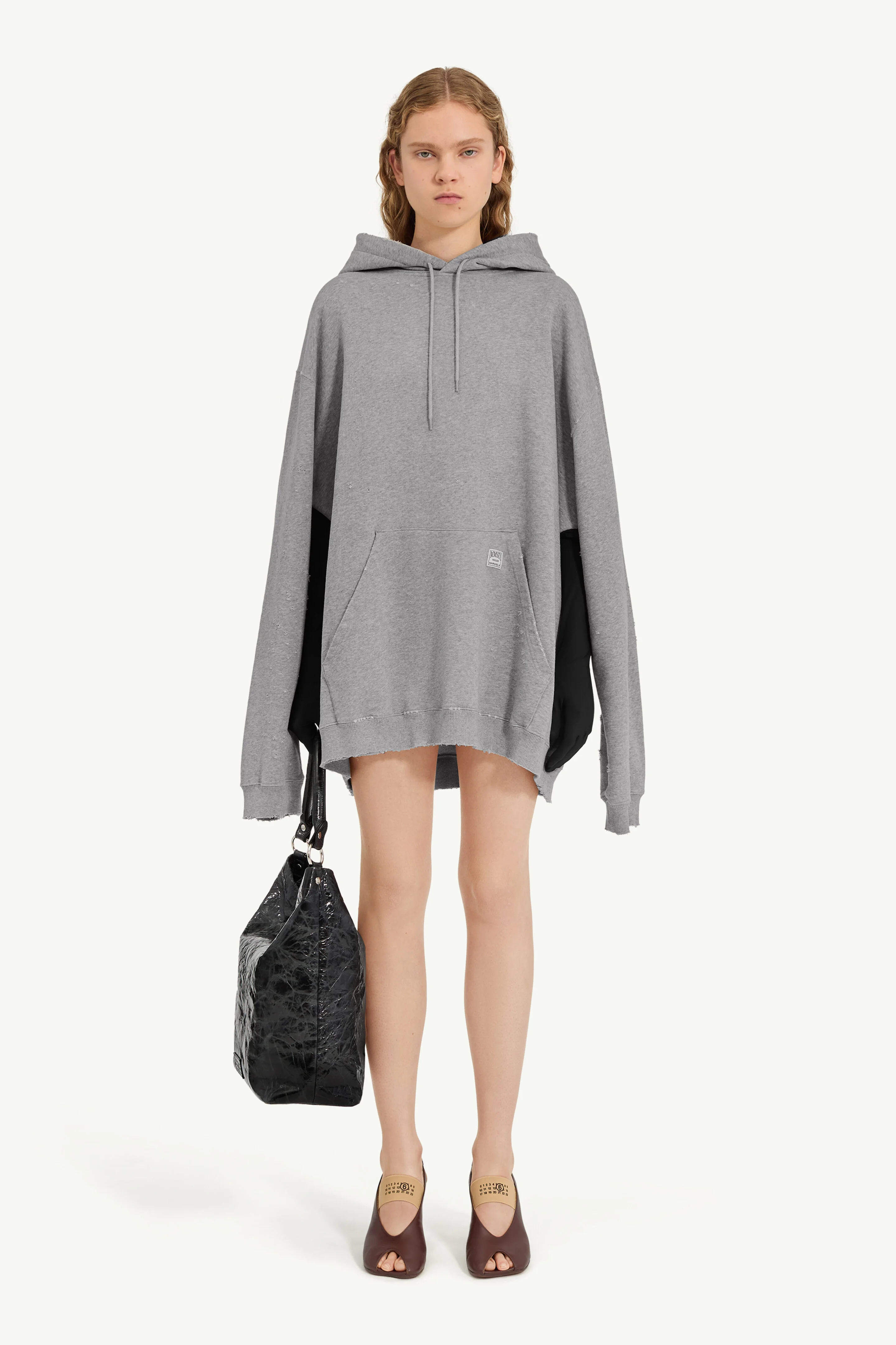 A cotton hooded sweatshirt with a kangaroo pocket and raw-cut hem. At the sides, black Lycra gloves are stitched into the seams: left loose, they fall as unexpected detail; when worn, they alter the silhouette. A functional disruption, finished with the MM6 white stitch line at the back. Product Details Item ID S52DA0083M25025853M Primary fabric: 100% cotton Lining: 100% cotton Mini length Removable belt with elongated glove detail Long sleeves Hooded neckline No visible closure White stitch line at the back Made in Italy