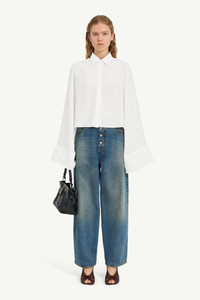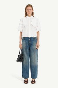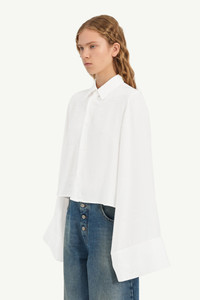 Cut in tonal jacquard, this shirt is patterned with stamped and handwritten graphics that echo the feel of vintage library records. A convertible design, the sleeves can be worn full length or folded short by fastening buttons at the shoulder. At the back, the MM6 white stitch line affirms its signature. Product Details Item ID S52DT0044M35737003J Primary fabric: 58% acetate 42% viscose-rayon Viscose blend jacquard Short sleeves with sculpted layered panels Long sleeves with exaggerated cuffs (optional) Shirt collar neckline Front button closure White stitch line at the back Made in Italy