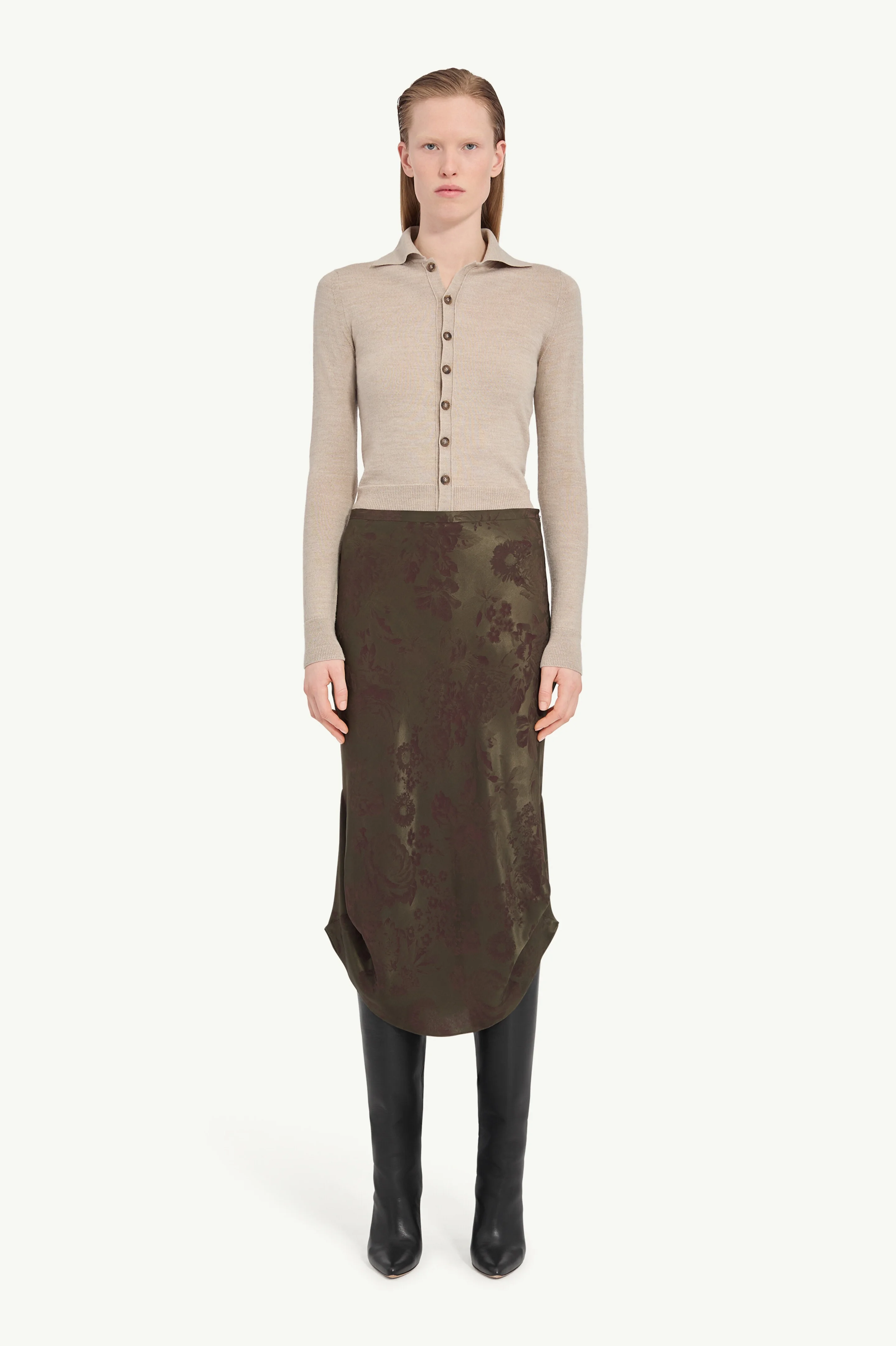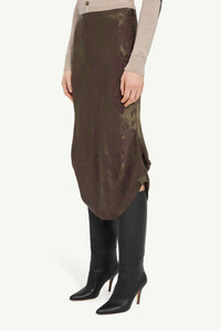 Tailored with a curved hem that mirrors MM6’s unconventional approach to form, this midi skirt showcases a tonal floral jacquard in rich olive and plum. Its voluminous silhouette gathers subtly at the sides, creating soft, unexpected structure. A discreet white stitch line at the back nods to the Maison’s subversive identity. Product Details Item ID S52ME0025M35471001J Primary Fabric: 58% Acetate 42% Viscose-Rayon Draped floral midi skirt in fluid jacquard Mid-rise silhouette Gathered detailing at the hem Concealed zip closure at the side White stitch line at the back Made in Italy Model is 180 cm tall and wears a size 42.