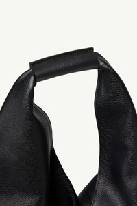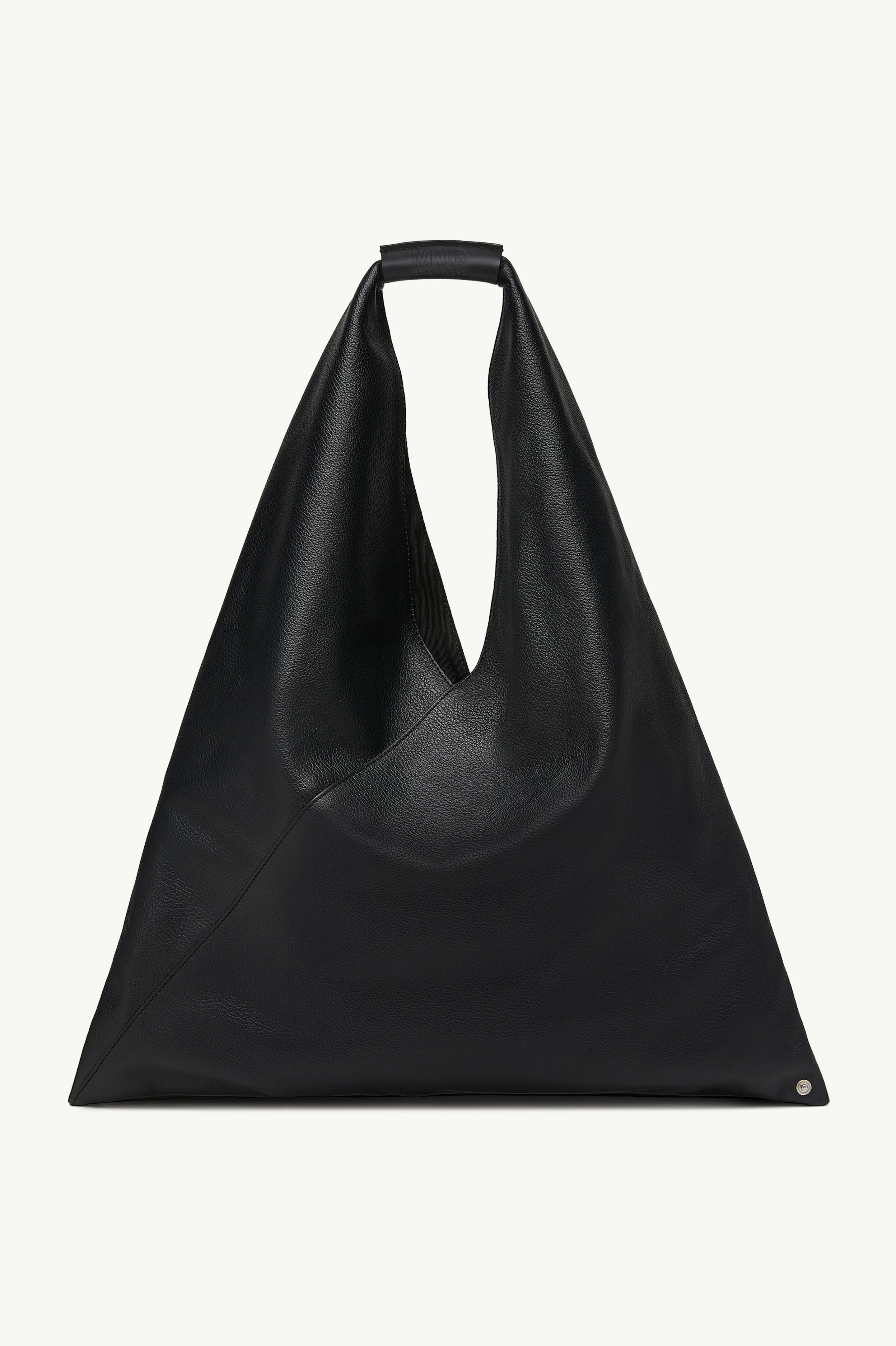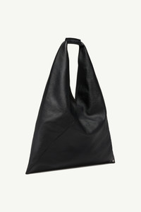 Japanese bag in grained leather. First introduced as part of the Autumn-Winter 2009 collection, the Japanese bag has since become MM6’s most emblematic accessory. Its distinctive triangular silhouette is inspired by the Japanese art of paper folding, origami. The buttons at its edges allow for the bag to change form through folding, evoking the Maison’s deconstructionist design codes. Each season, the Japanese bag is reinterpreted in additional sizes and a variety of innovative fabrics, rendering the accessory timeless. Product Details Item ID S54WD0039P4344T8013 Outer: 100% Grainy leather Lining: 100% Cotton Two different sections sewn together Two snap buttons on the bottom to change the shape of the bag Leather cuff with numeric logo White stitch line at the back at the back Button closure on leather detail Inside pocket with button closure Internal black label with white logo
