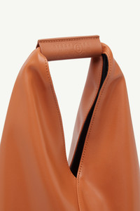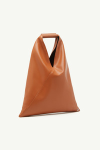 Japanese bag classic small in PU leather. First introduced as part of the Autumn-Winter 2009 collection, the Japanese bag has since become MM6’s most emblematic accessory. Its distinctive triangular silhouette is inspired by the Japanese art of paper folding: origami. The buttons at its edges allow for the bag to change form through folding, evoking the Maison’s deconstructionist design codes. Each season, the Japanese bag is reinterpreted in additional sizes and a variety of innovative fabrics, rendering the accessory timeless. Product Details Item ID S54WD0043P4313T2222 Body: 60% Polyester, 40% Polyurethane Contrast: 100% Calf Leather Lining: 100% Polyester Metallic Parts: 100% Copper Handbag in leather-effect finish Soft triangular silhouette Top handle debossed with numeric signature White stitch line at the back