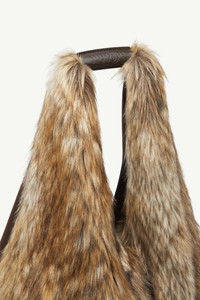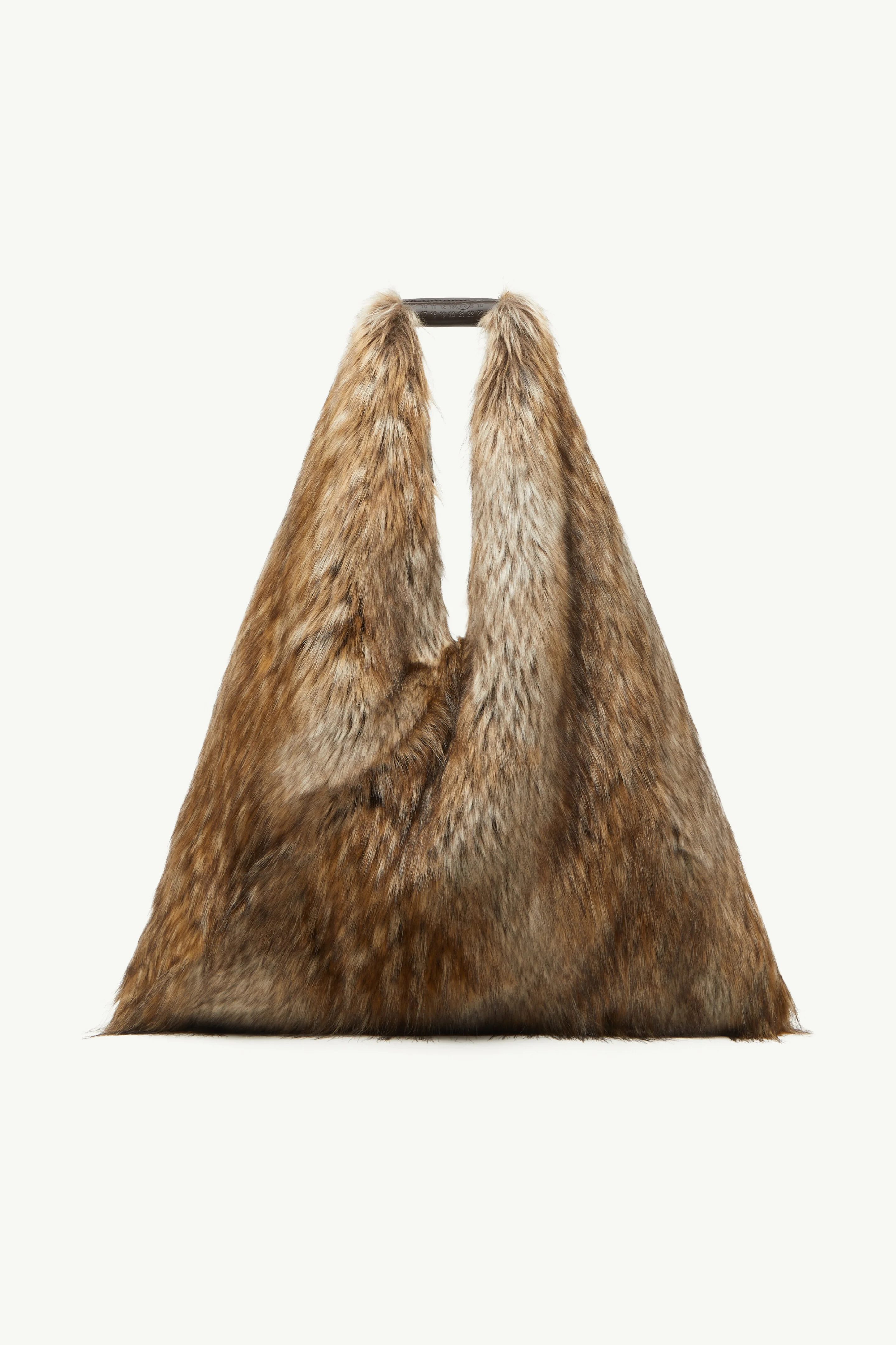 MM6’s iconic Japanese bag takes on a new texture in plush faux fur, softening its signature origami-inspired form. The bold triangular silhouette remains intact, offering a tactile contrast between structure and fluidity – an everyday statement that reimagines the Maison’s most emblematic accessory. Product Details Item ID S54WD0039P8486H9076 Body: 80% Acrylic 20% Polyester Contrast: 100% Calf Leather Lining: 100% Cotton Metallic Parts: 100% Copper Shopping bag in faux fur Leather top handle debossed with numeric signature White stitch line at the back Made in Italy