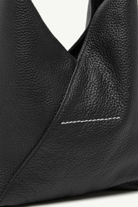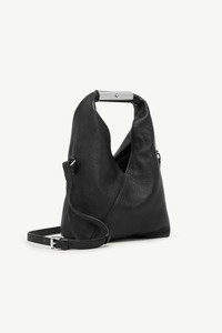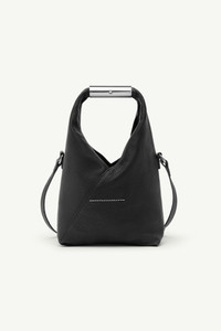 The Japanese Bag, a symbol of MM6 since Autumn-Winter 2009, is reinterpreted here in lightly padded grainy leather with a jewel-like metallic handle, structured bottom, and versatile crossbody strap. Its triangular folds, drawn from origami, retain the signature geometry while the handle adds a precise, architectural counterpoint. At the back, the white stitch line affirms the Maison’s identity. Product Details Item ID SB6WD0042P7255T8013 - Body: 100% calf leather - Lining: 100% cotton - Metallic parts: 100% zama - Grainy leather texture - Fixed metal handle - Magnetic closure on handle - White stitch line at the back - Clean with a mild leather cleanser without rubbing