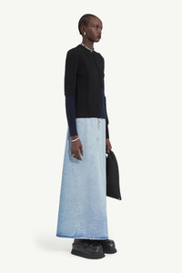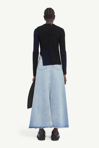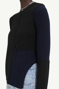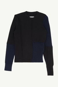 Spliced knit jumper with visible stitching between each portion of the design, purposefully exposing the construction of the garment. A slit opening at the hemline, highlighted by a thin rib elevates the design. Ribbed detailing at the collar and cuffs complete the creation. Gauge 12. Product Details Item ID S52HL0012S18283002F Model is 6' tall and wears a size S.