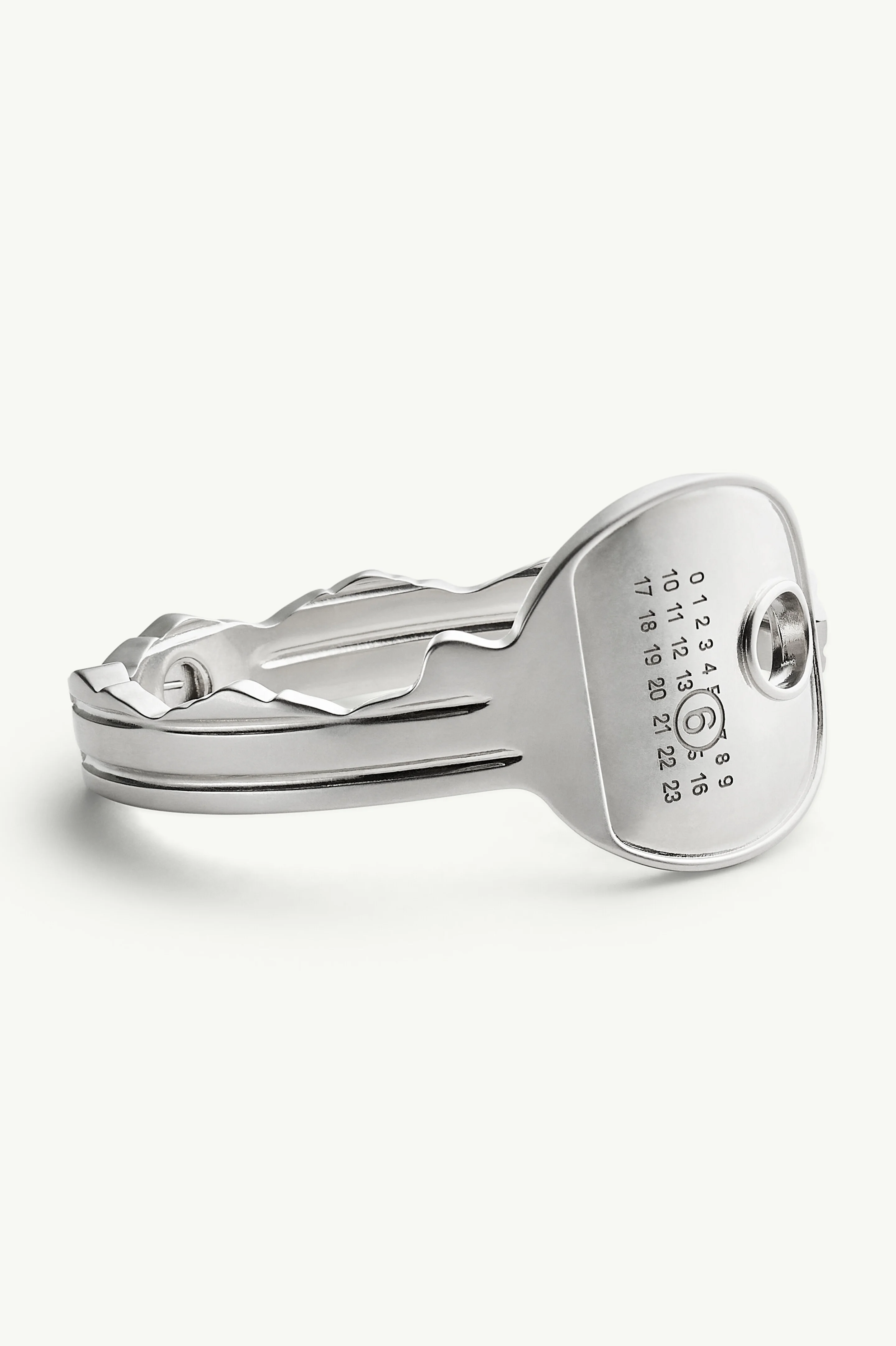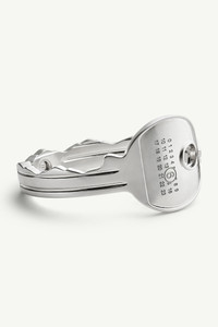 Crafted in silver-finished brass, this striking cuff bracelet features MM6's engraved numeric signature at the front, sculpted into a captivating key-inspired design. Bold and refined, it blends contemporary sophistication with an artistic interpretation, exemplifying MM6's vision for jewellery that transcends traditional boundaries. Product Details Item ID SM7UY0086P7105952 Body: 100% brass Cuff in polished silver Key shape Engraved MM6 numeric signature at the front Made in Italy The item comes in a white zipped bag