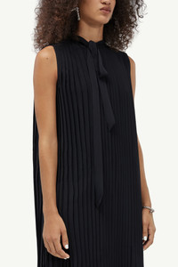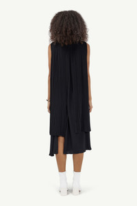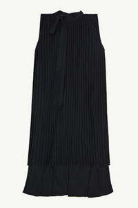 Sleeveless dress cut from fluid polyester. The silhouette has a cropped pleated portion that ties at the collar and can be worn simply on one side. An asymmetric back slit and round collar complete the lower layer of the design. Model is 178cm tall and wears size 40.