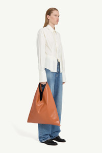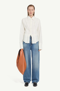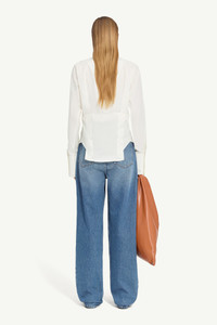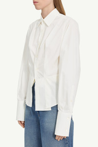 A subversive reworking of the classic white shirt, this piece juxtaposes precision tailoring with deconstructed elements. The darted waist detailing creates a sculptural effect, redefining traditional proportions. Oversized cuffs lend a dramatic touch, while the MM6 white stitch line subtly nods to the Maison’s unconventional aesthetic. Product Details Item ID S52DT0051M35256101 Primary Fabric: 100% Cotton Long cotton shirt with angular cut-outs Classic pointed collar Structured front and back paneling Button-down with asymmetrical hemline Exaggerated wide cuffs with two buttons Vertical stitched darts on the front Back panels with angular waist cut-outs White stitch line at the back Made in Italy Model is 180 cm tall and wears a size 42.