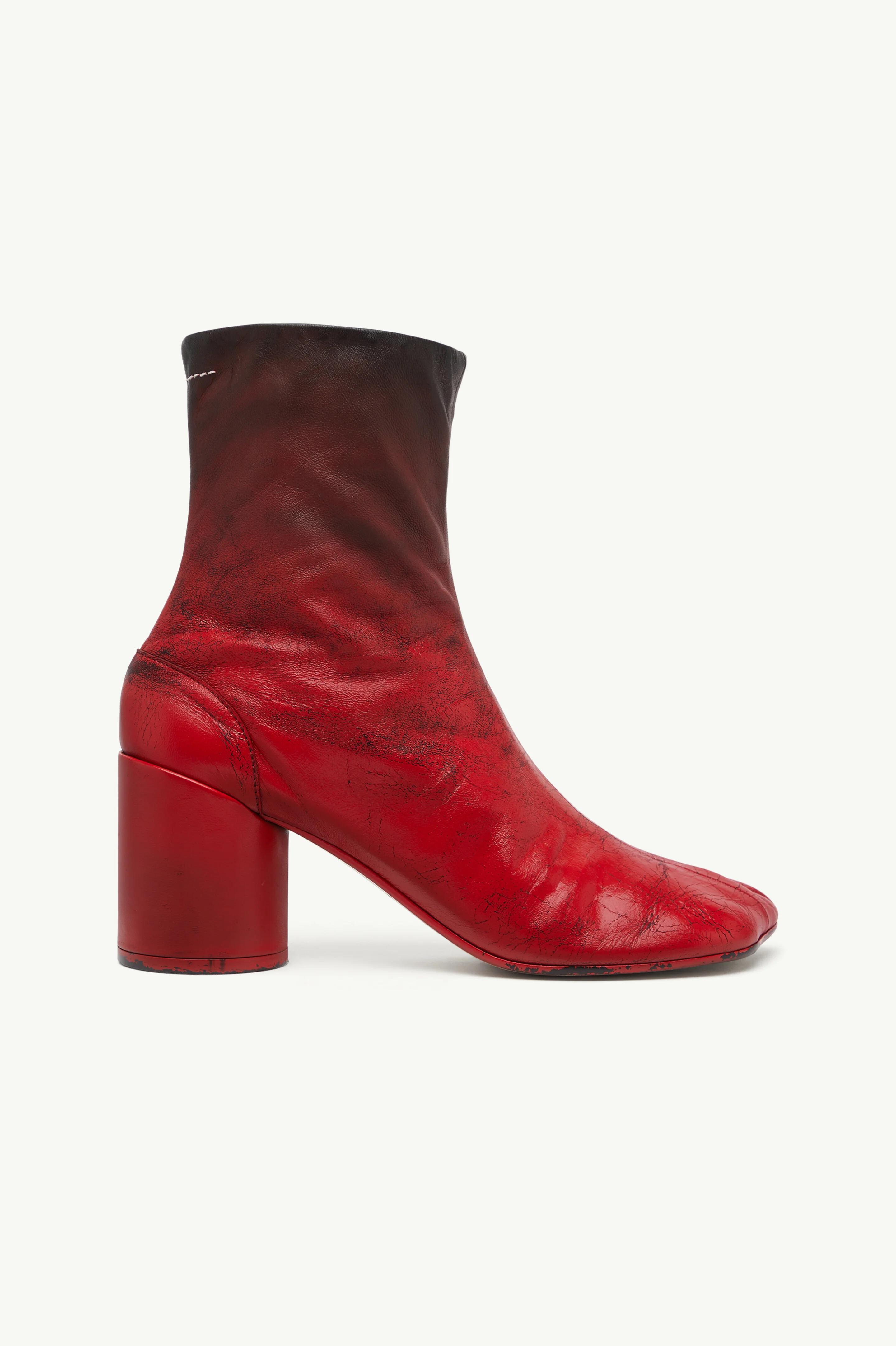 A subtle tension between structure and softness. These mid-ankle boots feature MM6’s signature anatomic toe and rounded block heels, cut in a textured finish that softens in an ombre fade. Finished with the Maison's signature white stitch line at the back. Product Details Item ID S66WU0131P7439HB097 Primary material: 100% Nappa leather Secondary fabric: 80% Viscose, 15% Polyamide, 5% Elastane Tertiary fabric: 100% Cotton Mid-ankle boots with ombre fade effect Anatomic toe Rounded cylindrical block heels Inner side zip closure White stitch line at the back Made in Italy