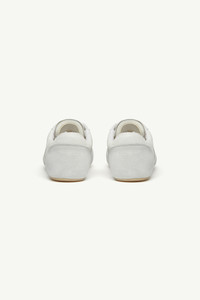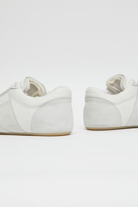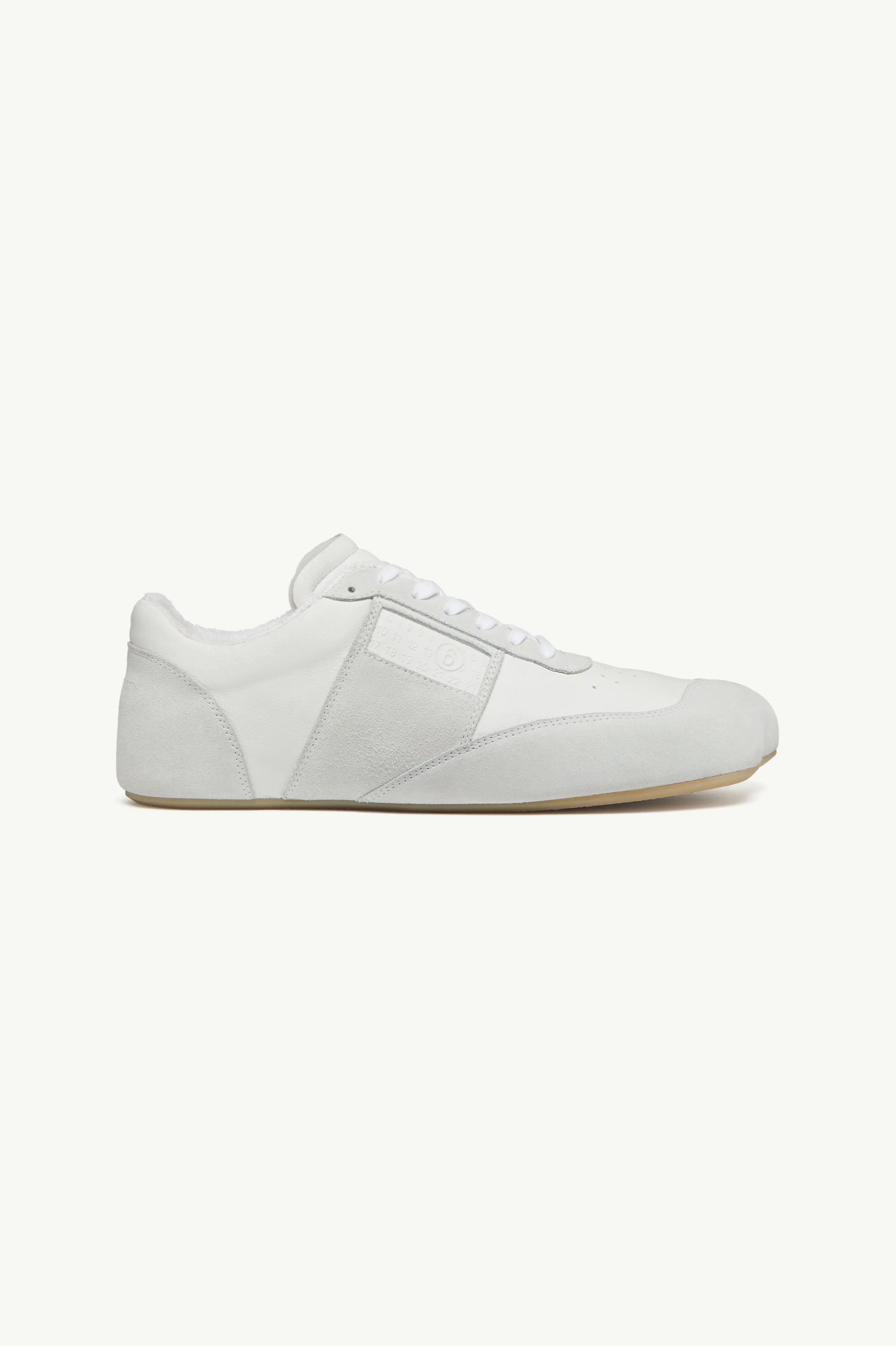 In a muted white palette, these sneakers refine everyday wear through a slim sole and an anatomic toe shape. The numeric signature at the side and signature white stitch line at the back encapsulate MM6’s subdued yet distinct language – an essential form distilled to its defining elements. Product Details Item ID S66WS0106P6435T1003 Upper: 100% calf leather Contrast: 100% calf leather Lining: 60% cotton, 40% polyester Inside: 100% calf leather Sole: 100% rubber Flat rubber sole Low-top sneaker silhouette Lace-up closure, seven eyelets per side Mix of smooth and suede panels on upper Perforation details on toe box Contrast panel on side Padded collar and tongue with shearling trim Small horizontal stitching on heel counter MM6 anatomic shape White stitch line at the back Made in Italy