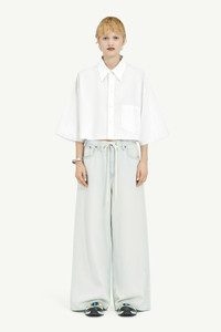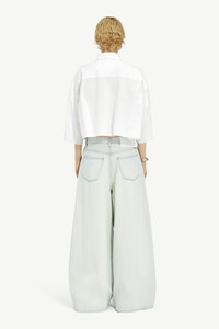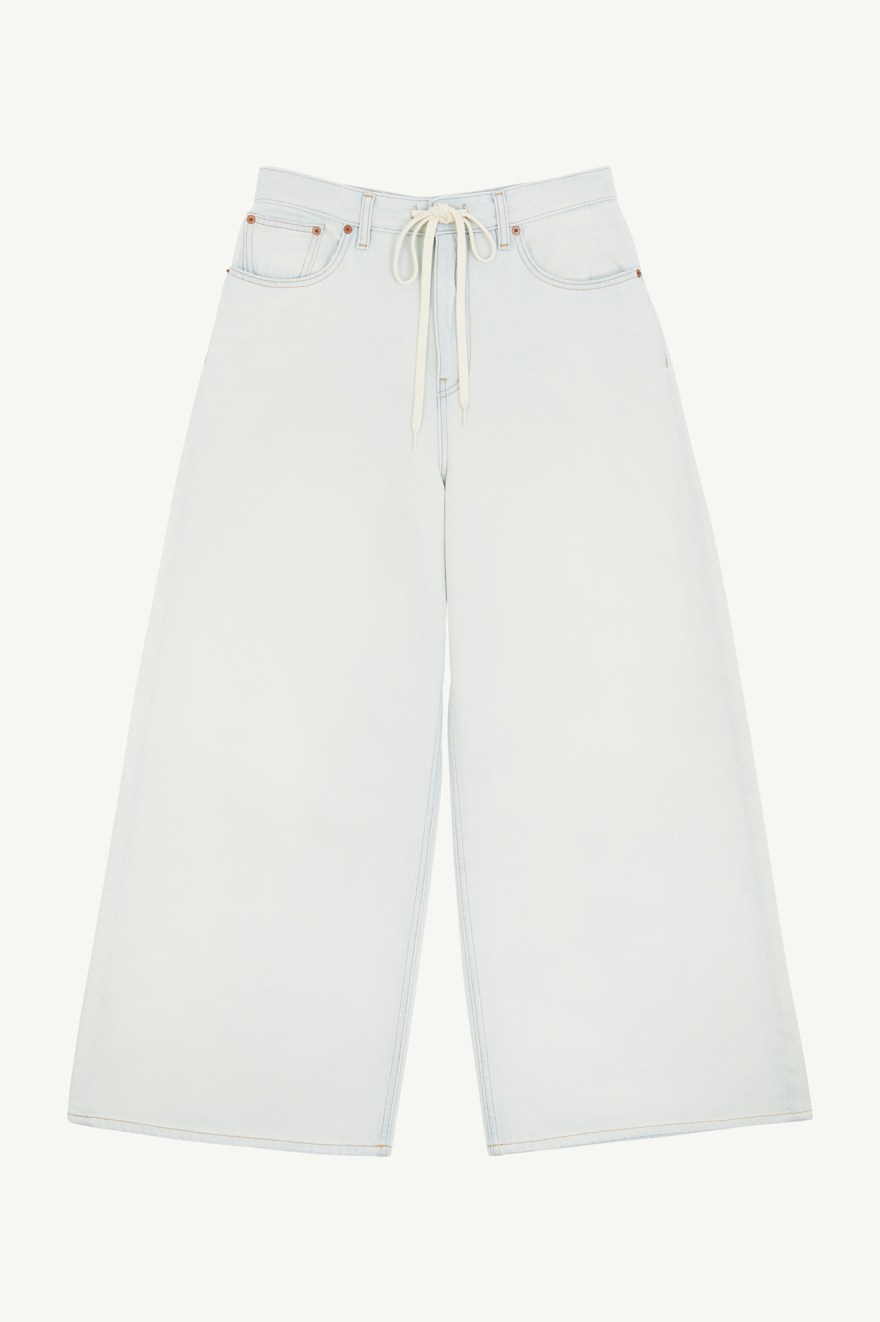 MM6’s low-rise trousers are crafted from light blue cotton denim with a loose fit and wide leg. The style is Made in Italy and characterised by button and draw-string closure and belt loops. The brand’s discreet yet distinct signature, a horizontal line of white stitches, is found on the back of the garment, along with the numeric signature jacron label. Product Details Item ID S52LA0228S30460992 Composition: 100% cotton Pocket lining: 65% polyester, 35% cotton Lightweight denim 5-pocket trousers Low-waist Wide leg Button and draw-string closure Belt loops White stitch line and MM6 numeric signature jacron label at the back Loose fit Made in Italy Model is 178 cm tall and wears a size 28.