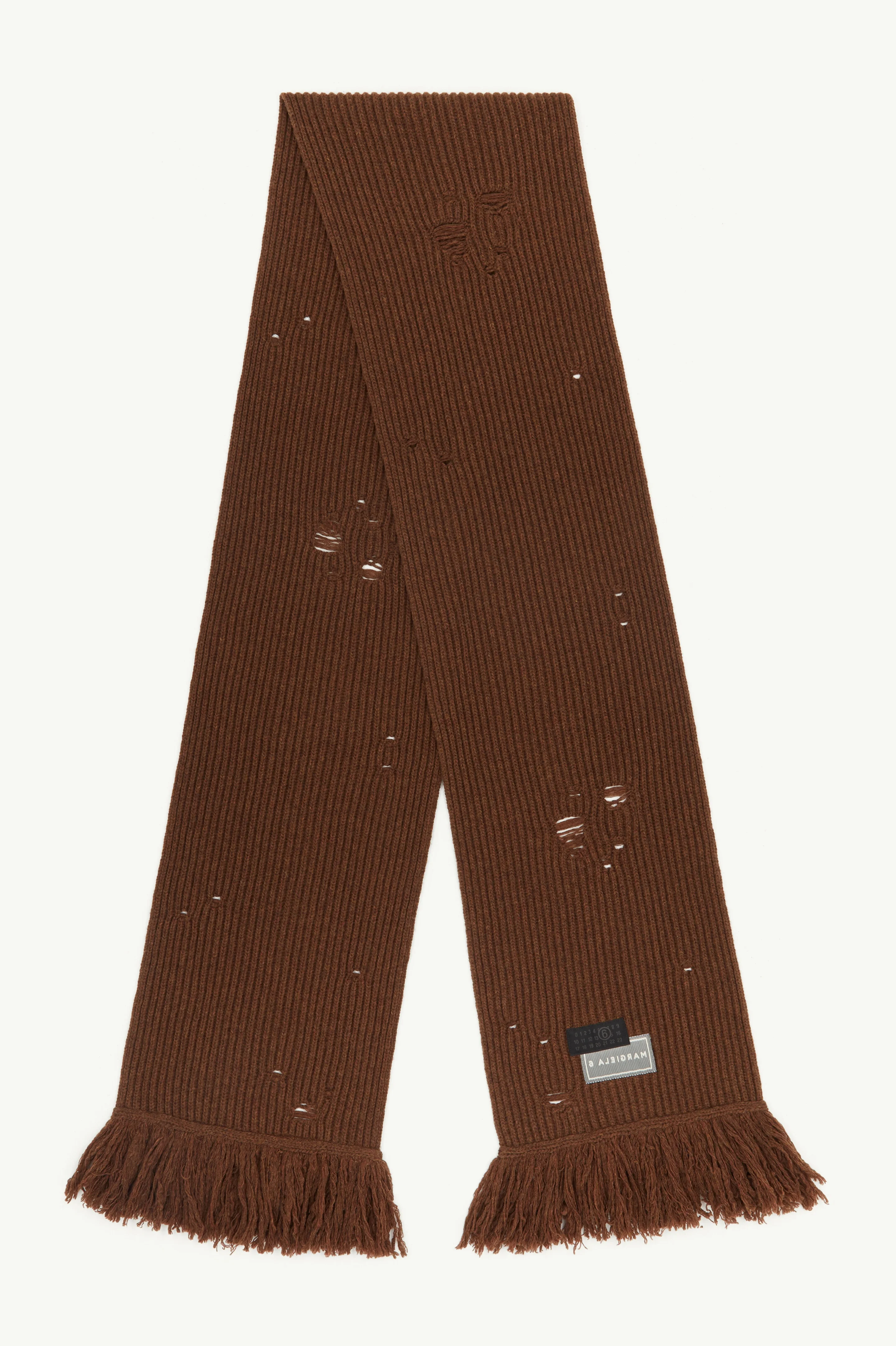Knitted from soft wool, this elongated scarf features distressed stitches and a textural raw fringe. The reversed MM6 signature and numeric artwork patch disturbs the symmetry, offsetting the knit’s rhythm with a note of visual interruption. An accessory reworked into statement. Product Details Item ID S52TE0056M13138142M Primary Fabric: 80% Wool 20% Polyamide-Nylon Oversized rib-knit scarf Distressed detailing Long fringe trim Dual artwork patch at the hem Made in Italy
