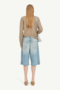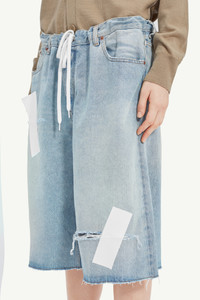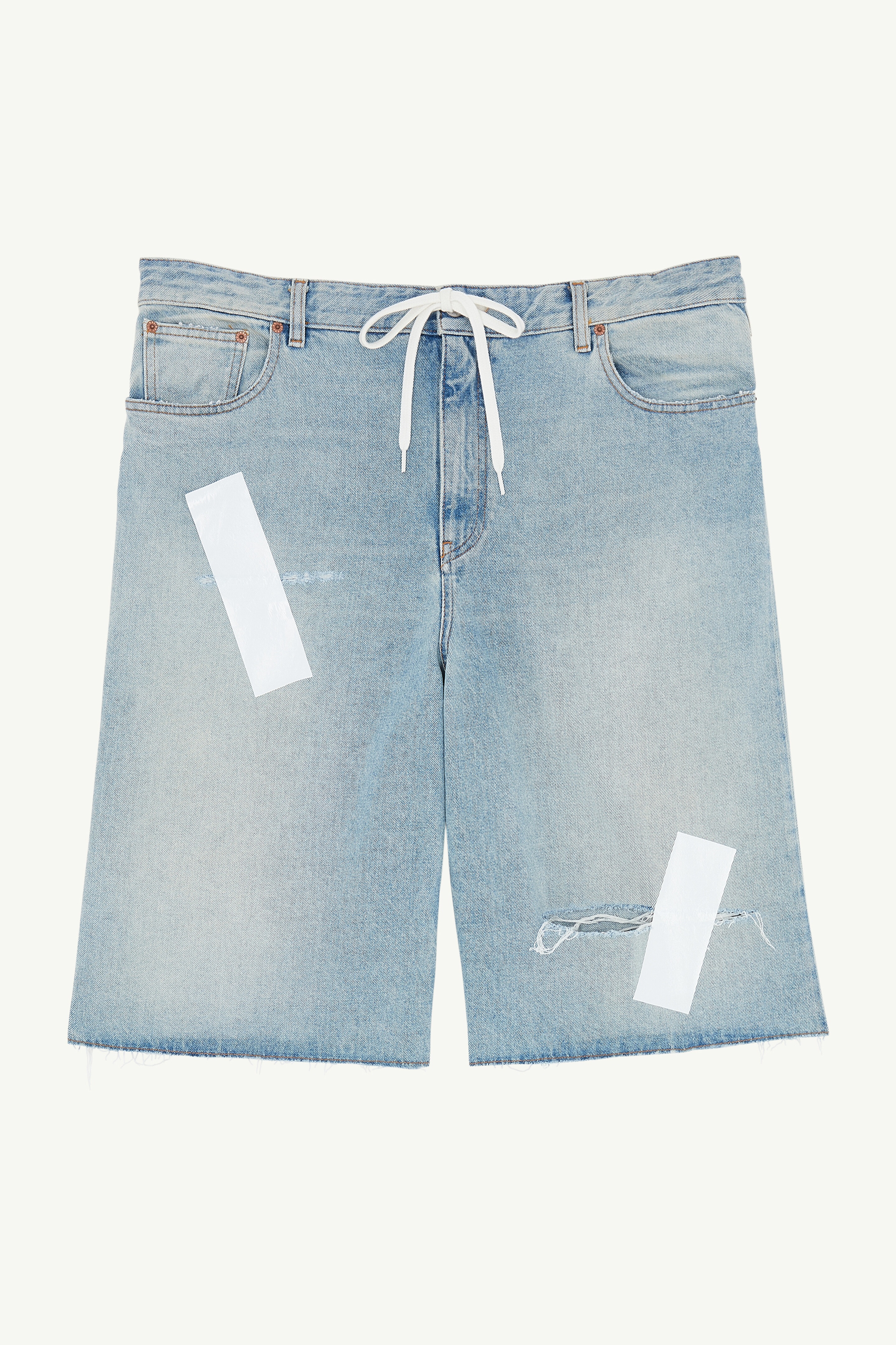 These blue denim shorts infuse MM6’s deconstructivist approach into casual style with their innovative taping and effortless drawstring tie. The wide-leg cut and relaxed fit offer a fresh take on classic denim, blending comfort with modern design. The white stitch line and MM6 numeric artwork at the back highlight the Maison’s distinctive signature. Product Details Item ID S52MU0126M30019964 Composition: 100% cotton Pocket lining: 65% polyester, 35% cotton Light blue denim 5-pocket short Regular waist Wide leg Zip and button closure Off white drawstring Tape like application at the front White stitch line and MM6 numeric signature jacron label at the back Made in Italy