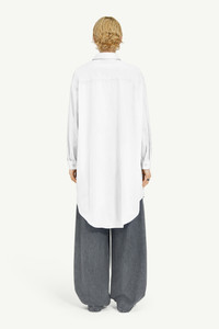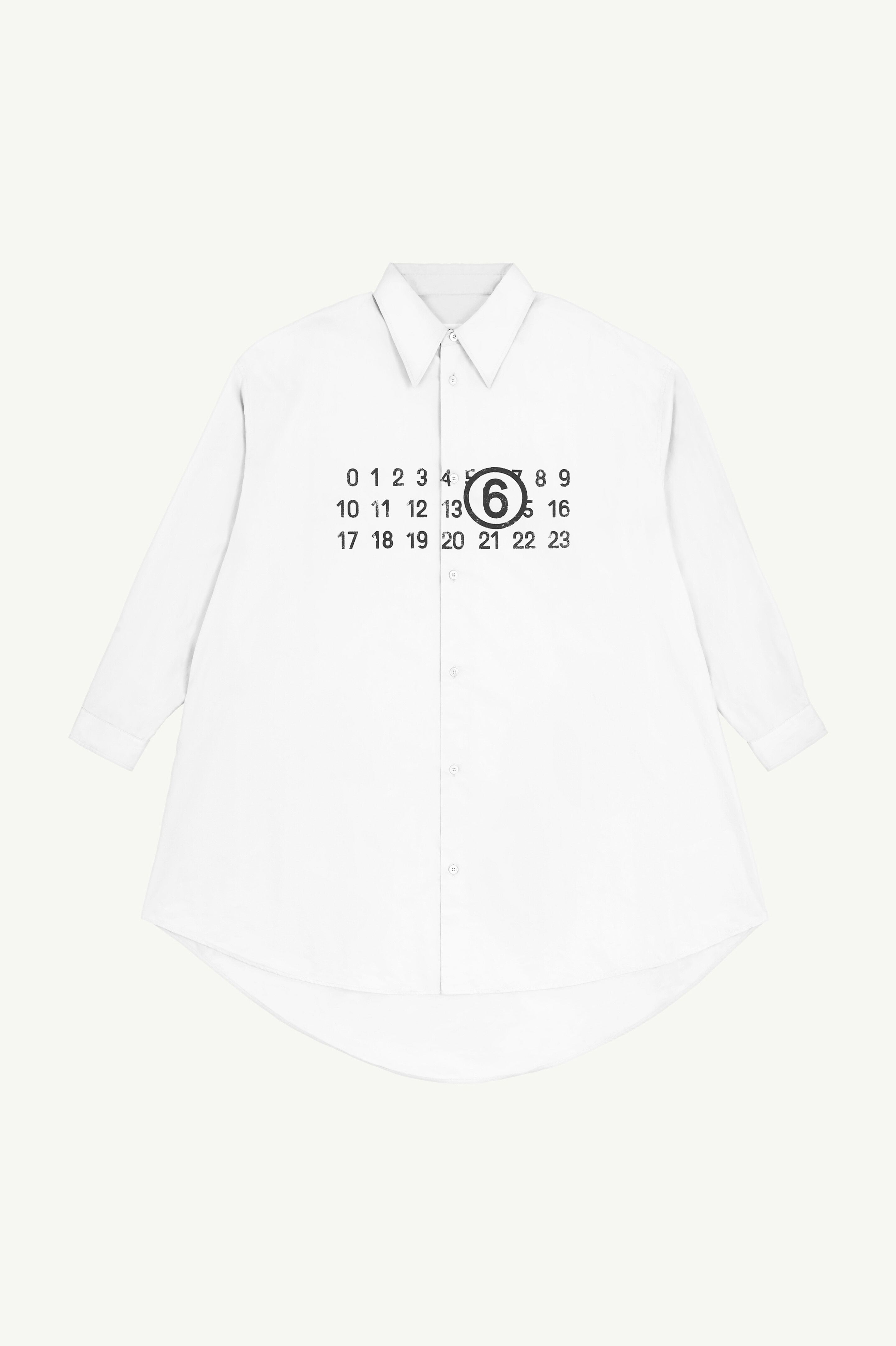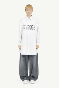 MM6’s shirt dress is crafted from cotton poplin featuring the brand's numeric signature print, then draped to an oversized silhouette. A classic re-imagined, the dress is characterised by its dropped shoulders, buttoned cuffs, side slits, curved hem and pointed collar. MM6’s discreet yet distinct signature, a horizontal line of white stitches, is found on the back of the garment. Product Details Item ID S52CT0780S47294100 Composition: 100% cotton Cotton poplin dress with MM6 numeric signature at the front Pointed collar Dropped shoulder Button closure Buttoned cuffs Curved hem Side slits White stitch line at the back Made in Italy Model is 178 cm tall and wears a size M.