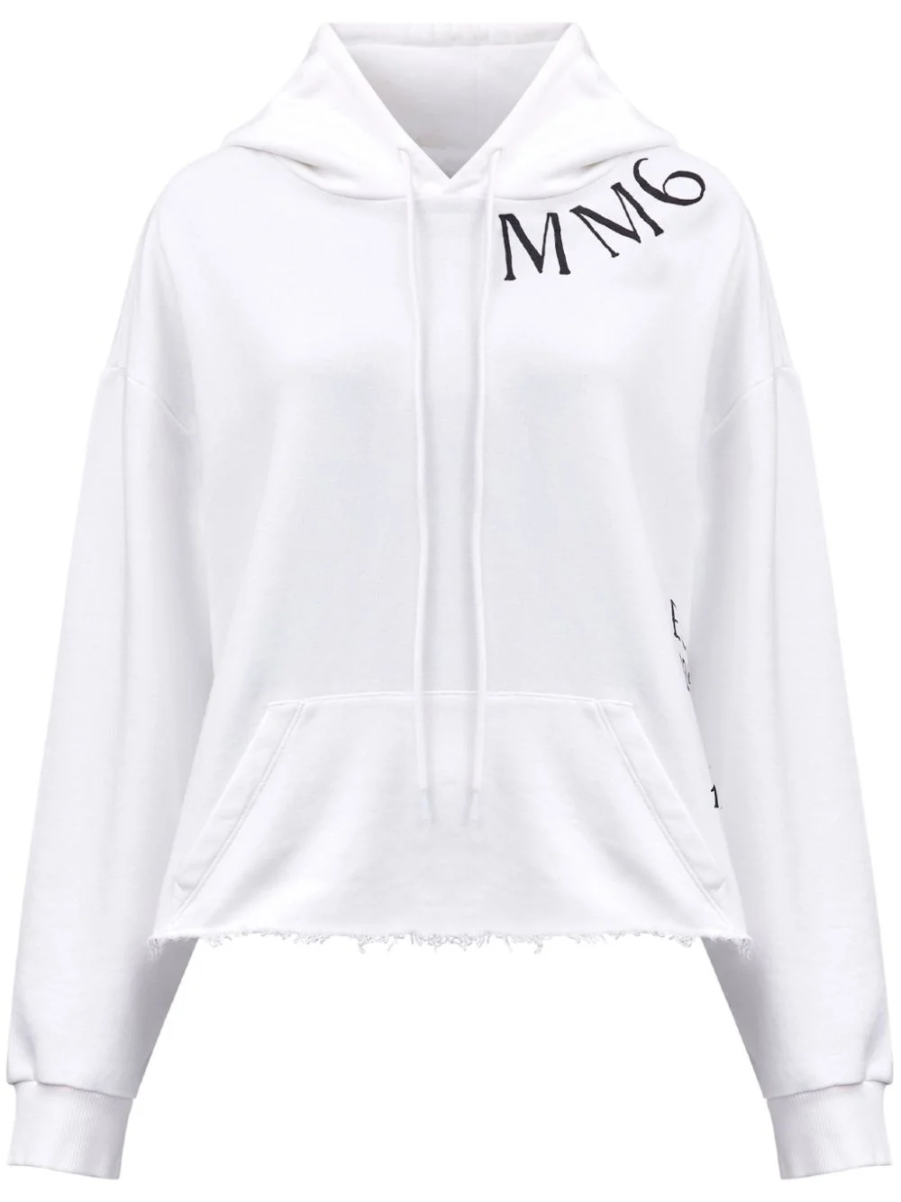 logo-print hoodie Highlights - White/black - Cotton - Jersey texture - Drawstring hood - Logo print to the side - Drop shoulder - Long sleeves - Signature numbers motif - Front pouch pocket - Raw-cut hem Imported Composition Cotton 100% Washing instructions Read Manufacturer Guidelines