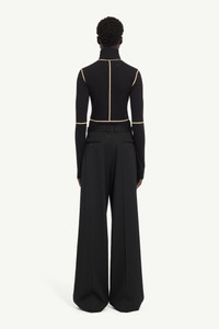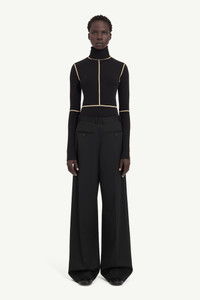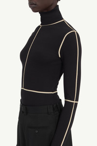 Inspired by the tools of the atelier, this fitted turtleneck bodysuit features visible contrast seams that echo dressmaker’s marker lines. Both technical and sculptural, the lines trace the body with intent. A white stitch line at the back subtly nods to MM6’s signature. Product Details Item ID S52NA0072M20125900 Primary fabric: 66% Cotton, 34% Polyester Bodysuit with high neckline and long sleeves High neckline (turtleneck) Long sleeves with seam detail Contrasting flatlock seams Snap-button closure at the base Vertical seam at the center front and back Horizontal seam at waist and elbows Smooth, unembellished surface White stitch line at the back Made in Italy Model is 180 cm tall and wears a size M.
