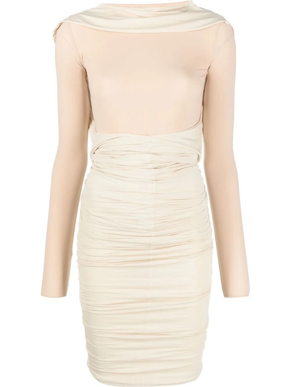 long-sleeve ruched dress light beige tonal design ruched detailing layered effect gathered neckline long sleeves above-knee length Made in Italy Composition Polyamide 86%, Elastane 14% SIZE & FIT Model measurements Height 5 ft 10 in(1.78 m) Bust/Chest 31.49 in(80 cm) Hips 36.22 in(92 cm) Waist 25.59 in(65 cm) Measurement HIPS 23.62 in(60 cm) LENGTH 66.92 in(170 cm) WAIST 23.62 in(60 cm) FittingInformation This piece fits true to size. We recommend you get your regular size Cut for a close fit Made with a mid-weight stretch fabric Washing instructions Dry Clean Only