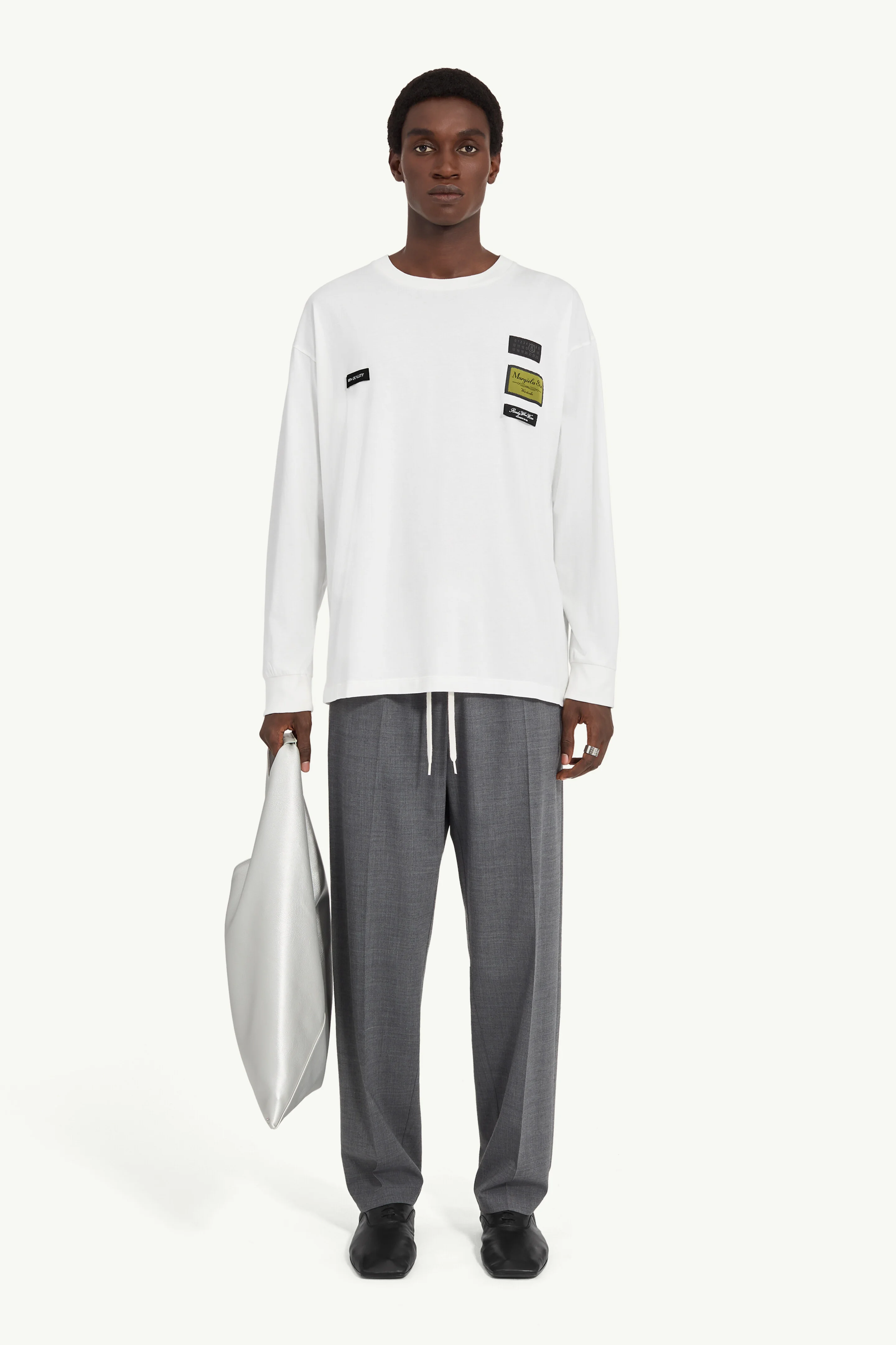 A cotton jersey long-sleeve T-shirt featuring jacquard labels embroidered across the chest. Traditionally placed on the interior, the labels are deliberately exposed, transforming functional markers into design features. At the rear, the Maison’s white stitch line completes the look. Product Details Item ID SH0NH0023M20170101 Primary fabric: 100% cotton Cotton jersey Patch applications on the chest Long sleeves Round neck White stitch line at the back Made in Italy