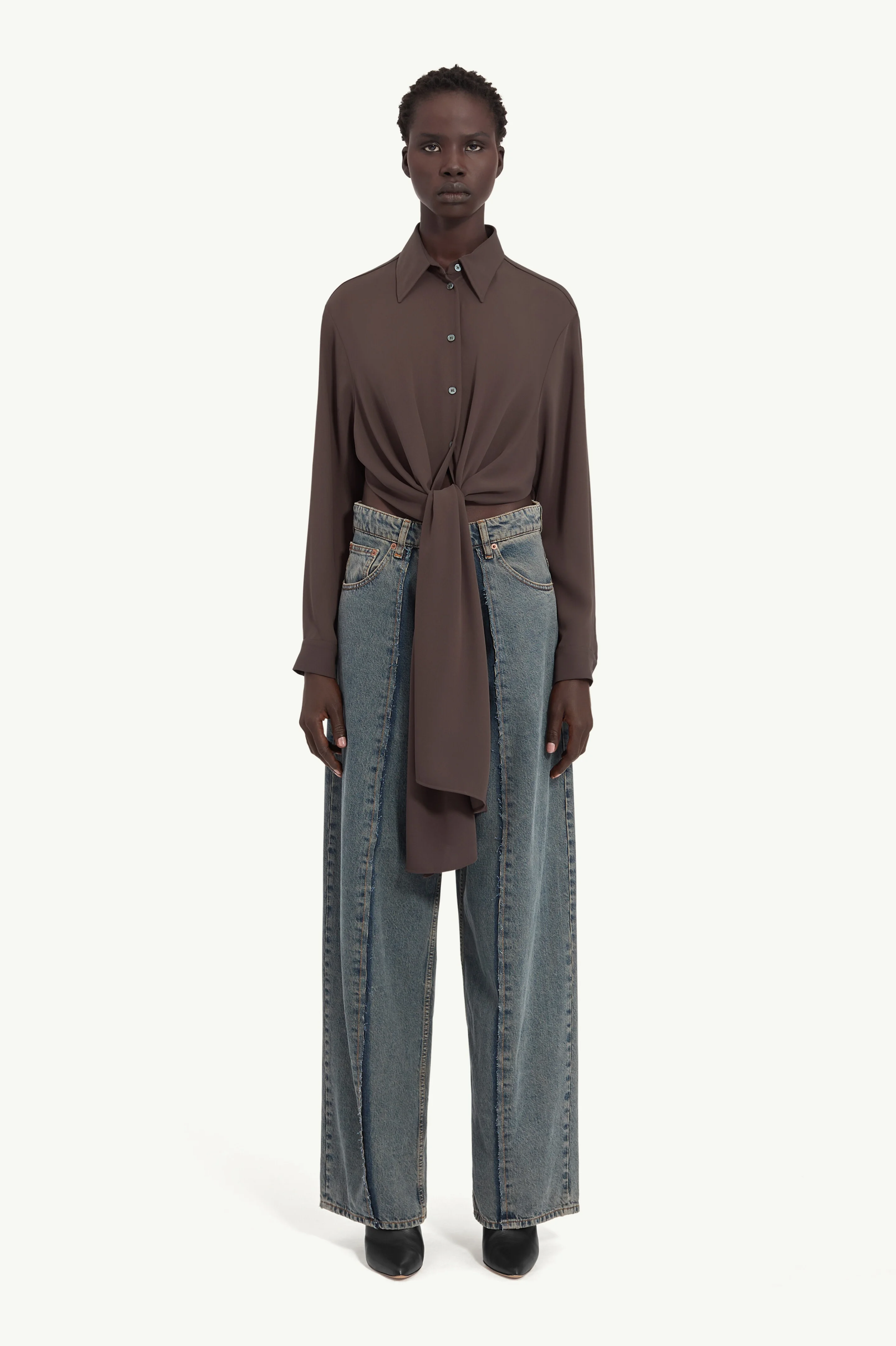 A fluid blouse that effortlessly balances structure and movement. Its button-down front and crisp collar exude classic tailoring, while the artfully draped front panel offers versatile styling – knotted at the waist for a sculptural silhouette or left loose for undone ease. The cropped, open-back detail injects a modern edge, subtly finished with the signature MM6 white stitch line. Product Details Item ID S52DT0049S43455134 Primary fabric: 100% polyester Waist tie front detail Long sleeves Shirt collar Button front closure Backless design White stitch line at the back Made in Italy Model is 180 cm tall and wears a size 42.