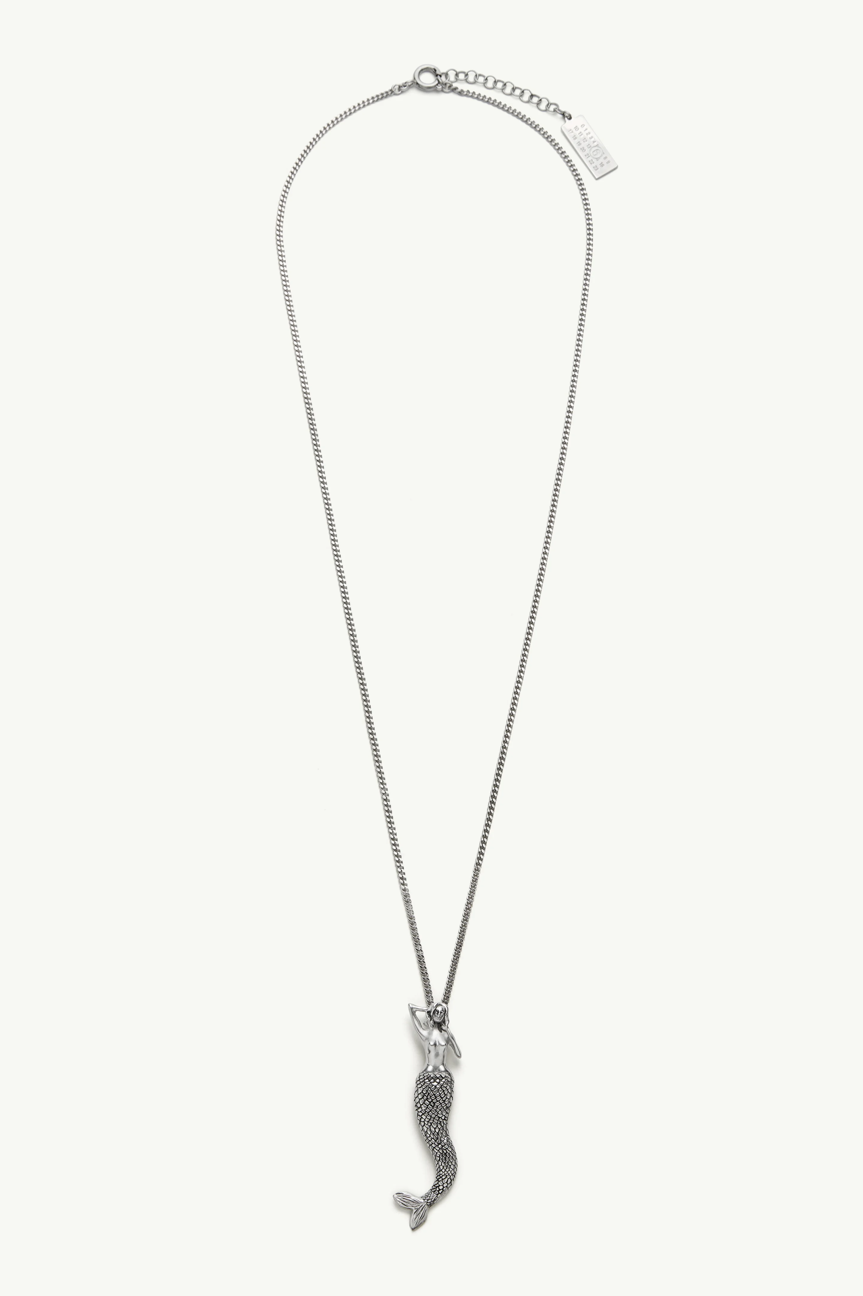 A streamlined mermaid pendant suspended from a slender chain. The body is elongated and fluid, defined by a smooth upper form and a textured tail. The Maison’s numeric artwork appears discreetly at the fastening. Product Details Item ID SM7UU0127P9161968 100% brass One size Brass necklace Mermaid pendant detail Engraved brand logo Avoid salt, chlorine water and aggressive liquid Made in Italy