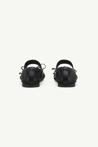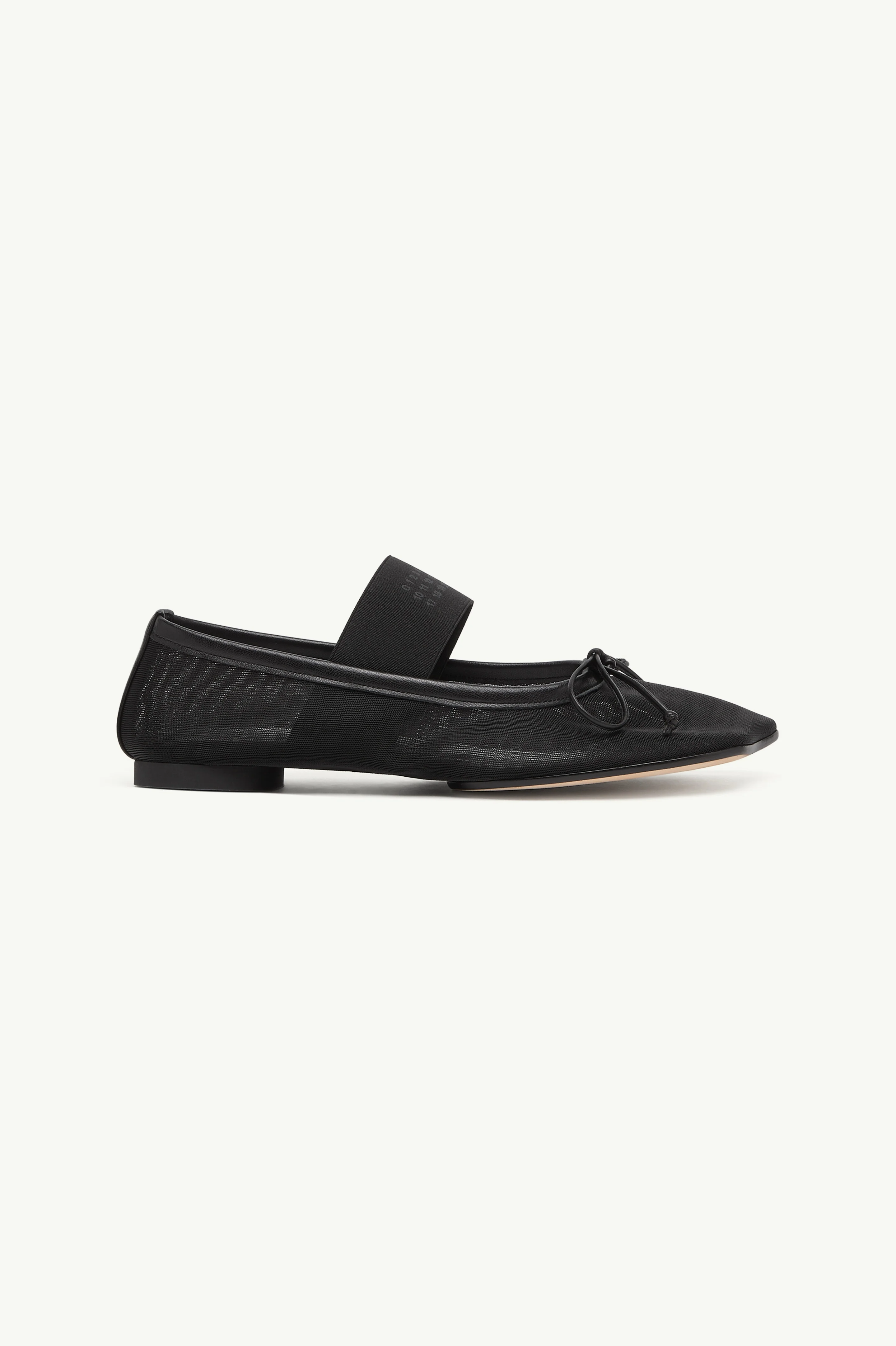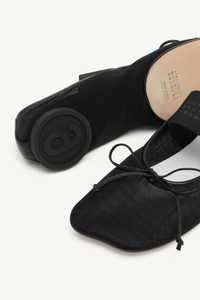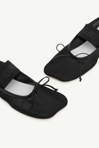MM6 reinterprets ballerinas in a transparent finish with its signature anatomic toe, subtly distorting a familiar silhouette. A delicate bow adds a touch of elegance, while the numeric logo elastic across the front grounds the design in the Maison’s codes. Product Details Item ID S59WZ0101P7138T8013 Upper: 100% Polyamide-Nylon Contrast: 100% Ovine Leather Contrast: 60% Viscose-Rayon 40% Cotton Inside: 100% Goat Leather Contrast: 100% Ovine Leather Sole: 100% Calf Leather Square toe style, slip-on design Flat sole with circular logo detail Decorative bow on the front Elastic strap with printed numbering Back heel tab detail Low-profile heel White stitch line at the back Made in Italy