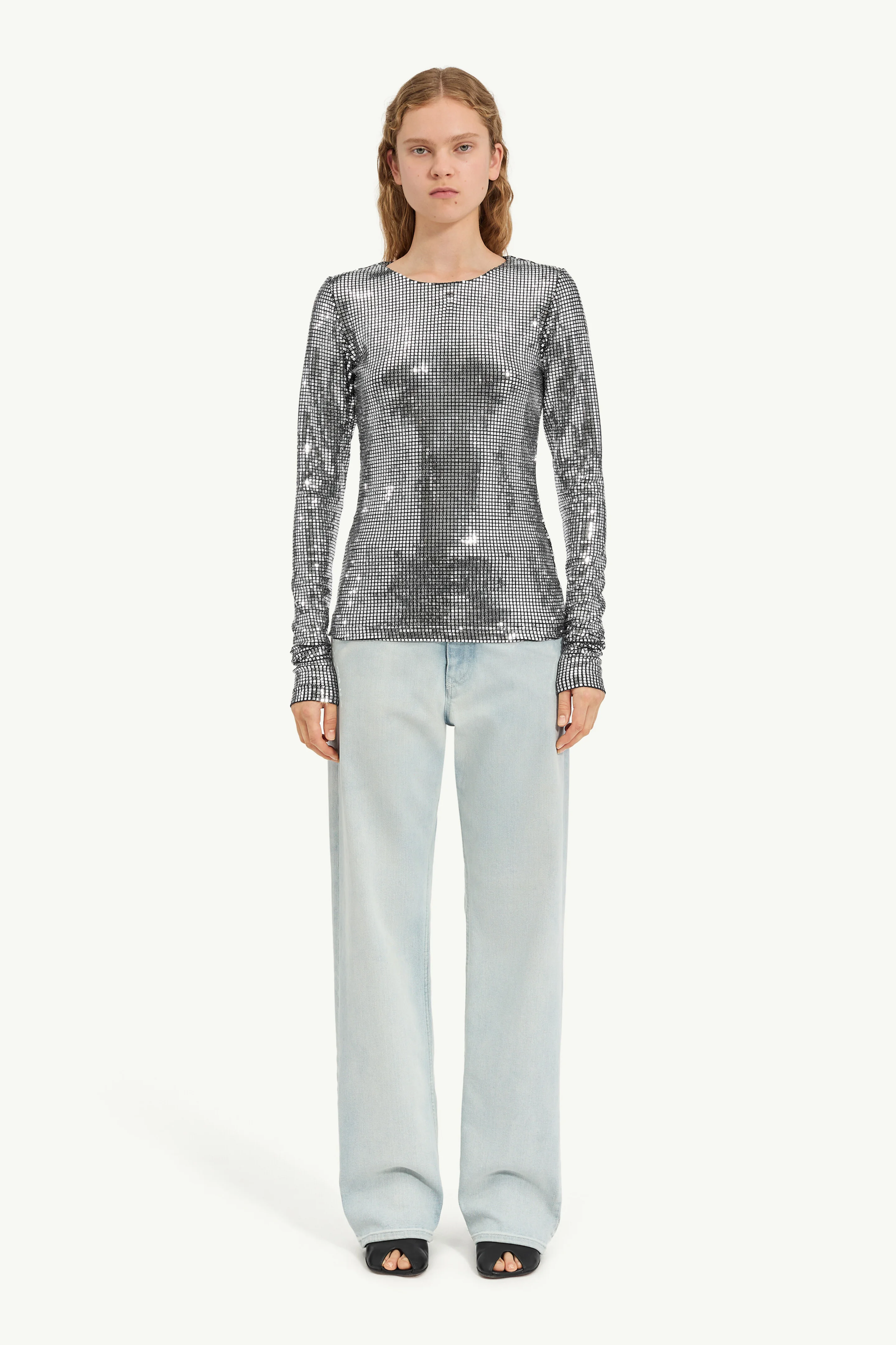 This long-sleeve top is realised in silver mesh, its gridded texture creating a fragmented mirror effect. The streamlined cut contrasts with the high-shine surface, producing a piece that is both minimal and striking. At the back, the MM6 white stitch line affirms its signature. Product Details Item ID S52NH0041S23734905 Primary fabric: 92% polyamide-nylon 4% elastane-spandex 4% metallic fibre Long sleeves Round neck White stitch line at the back Made in Italy