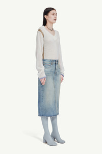 Skirt made with blue denim. The mid-length design has a singular construction with accentuated details in the front and rear central stitching. The 5-pocket silhouette is completed by a rear distressed slit. Product Details Item ID S52ME0007S30828963 Composition: 100% cotton Pocket lining: 65% polyester, 35% cotton Midi-skirt in denim Sand-wash treatment Button closure Embossed MM6 numeric signature on back pocket White stitch line at the back Shrunken fit Made in Italy Model is 5'11" tall and wears a size 40.